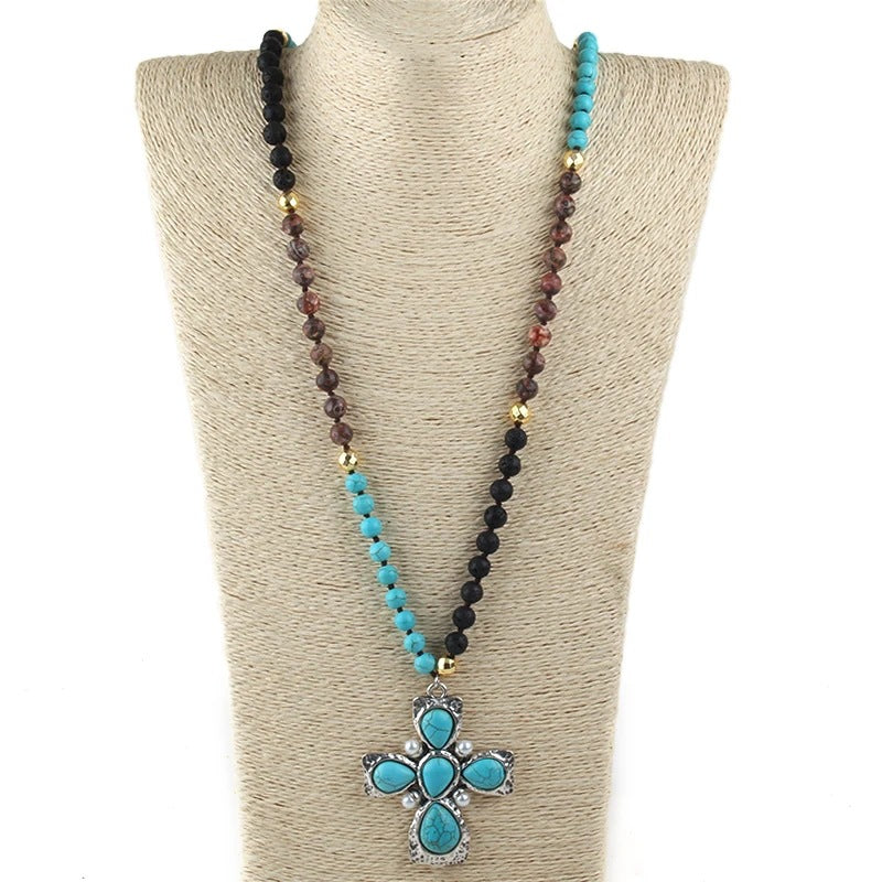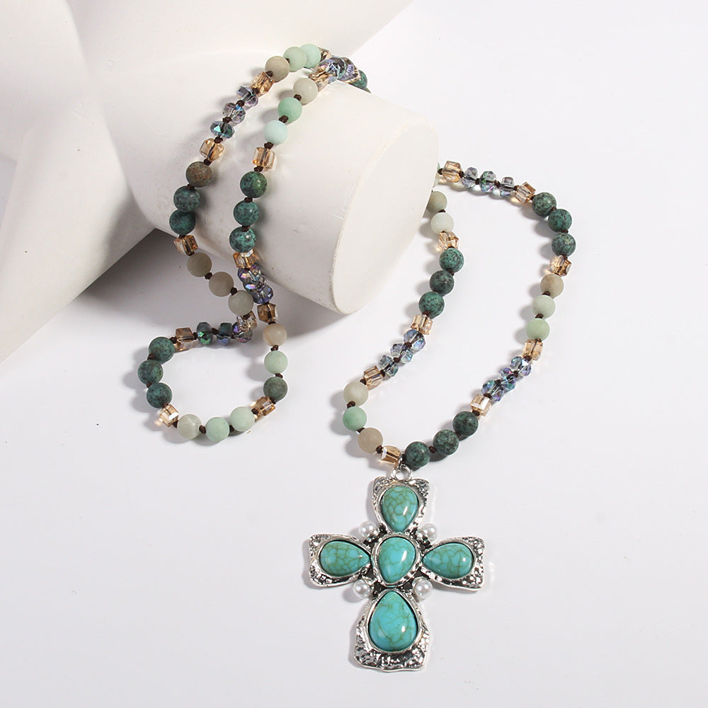 Retro Bohemian Cross natural stone Beaded Chain Pendant Necklace In Bulk Natural stone necklace