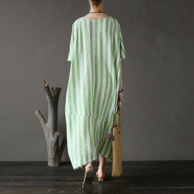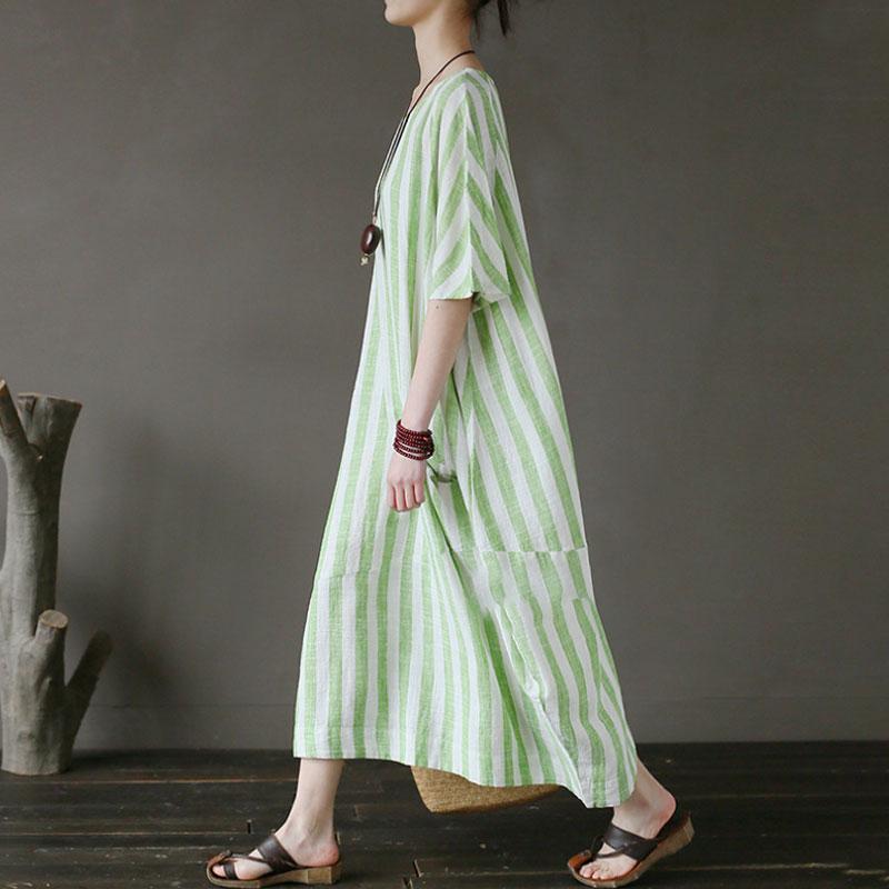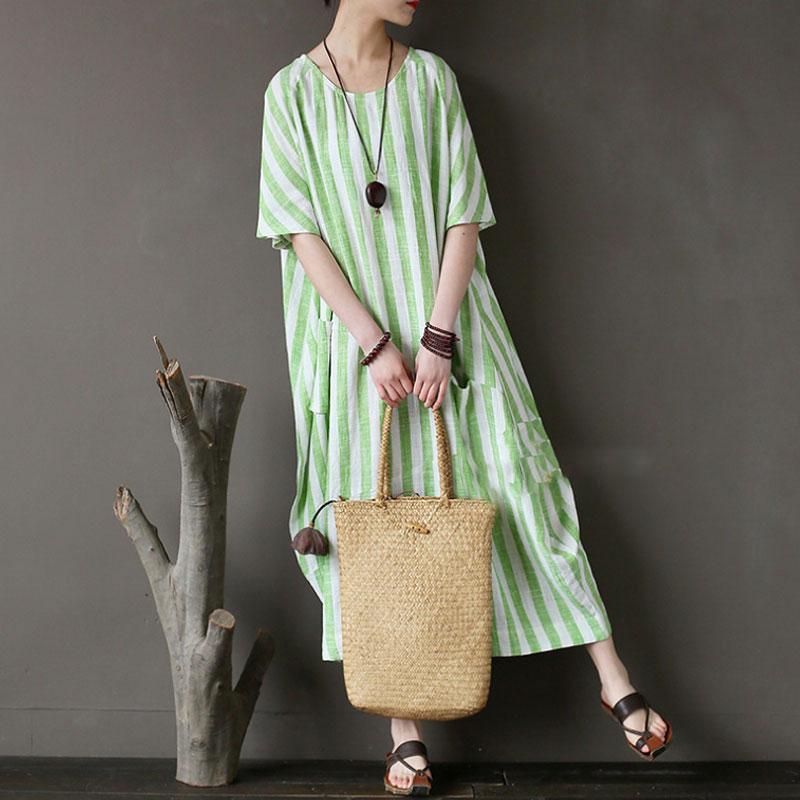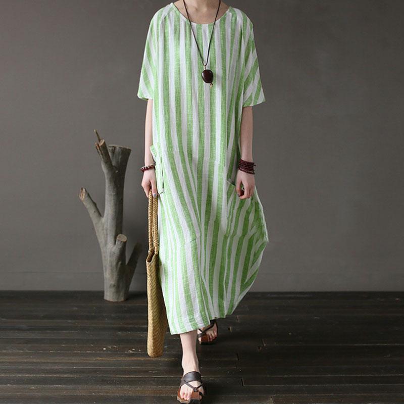 Retro Loose Round Neck Short Sleeve Green Stripe Dress