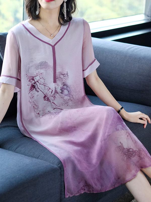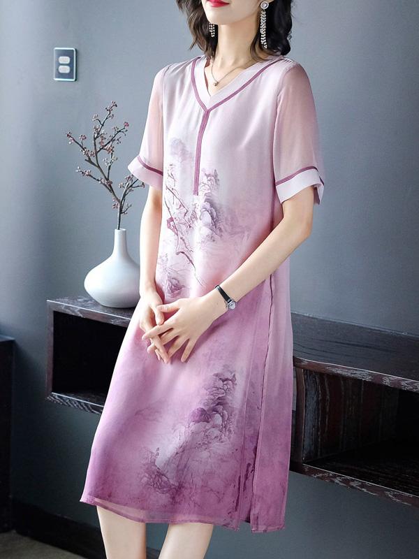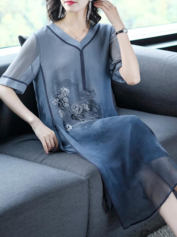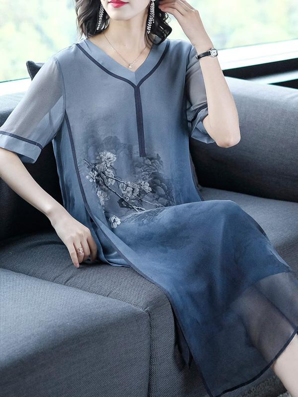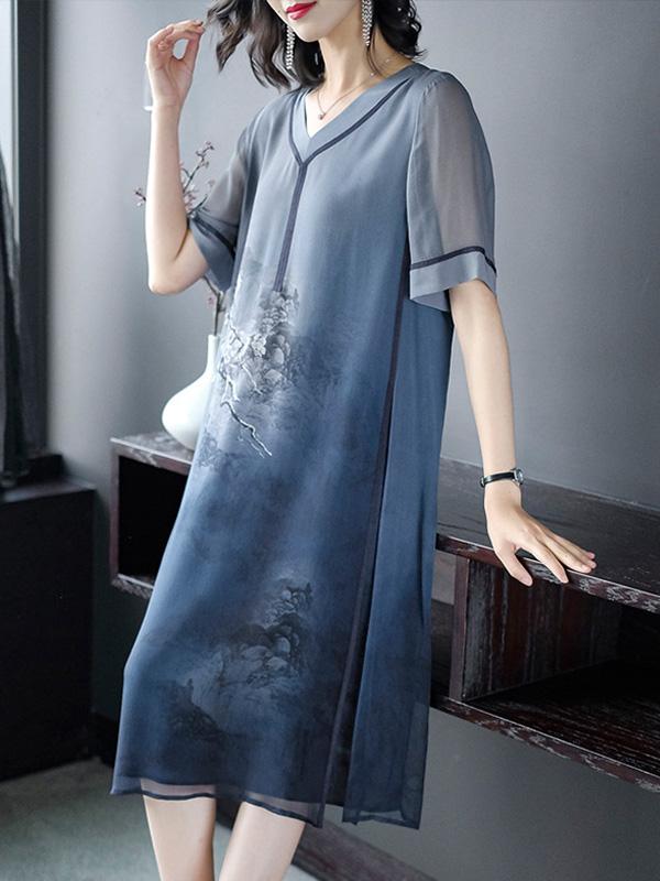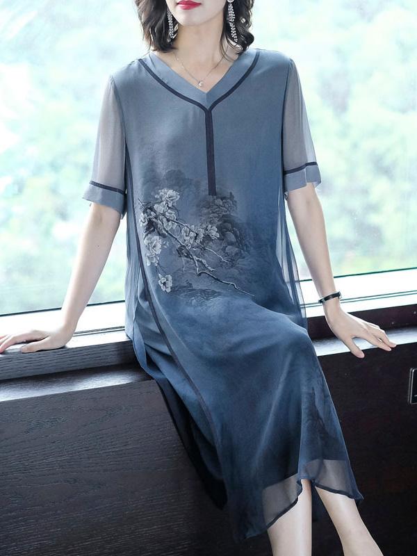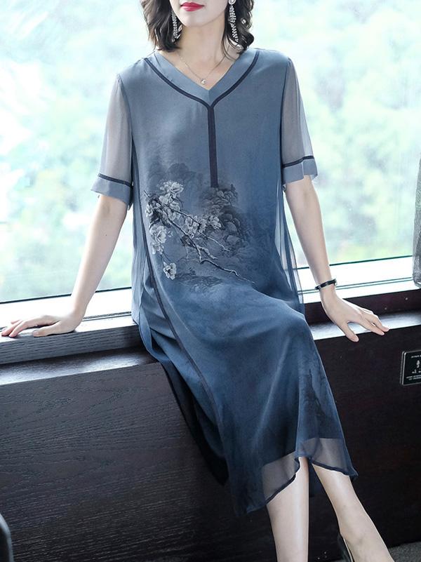 Retro National Style Printed Silk Midi Dress