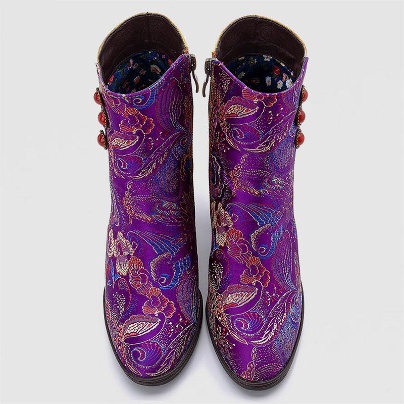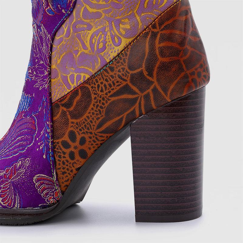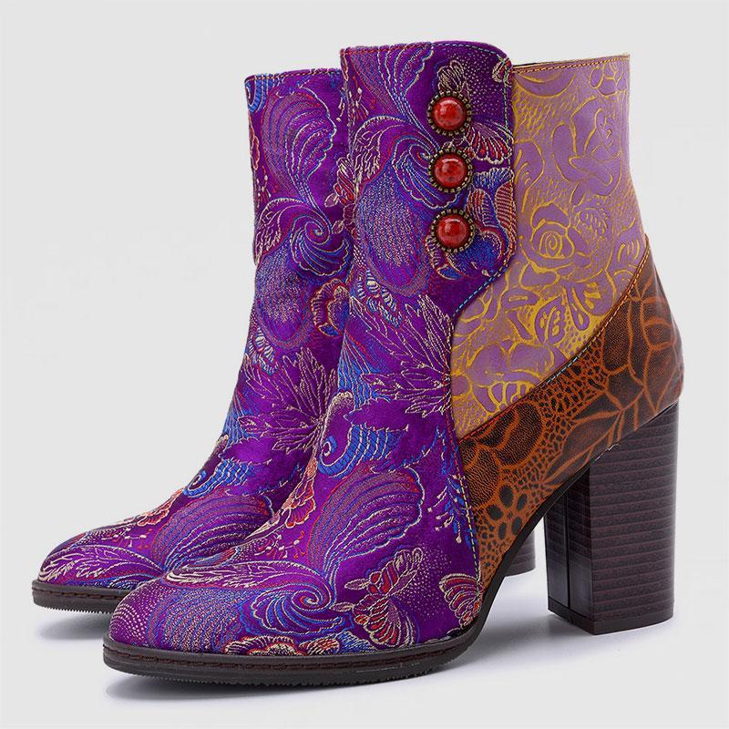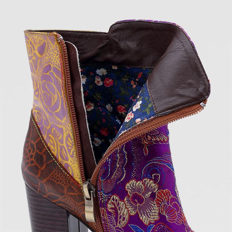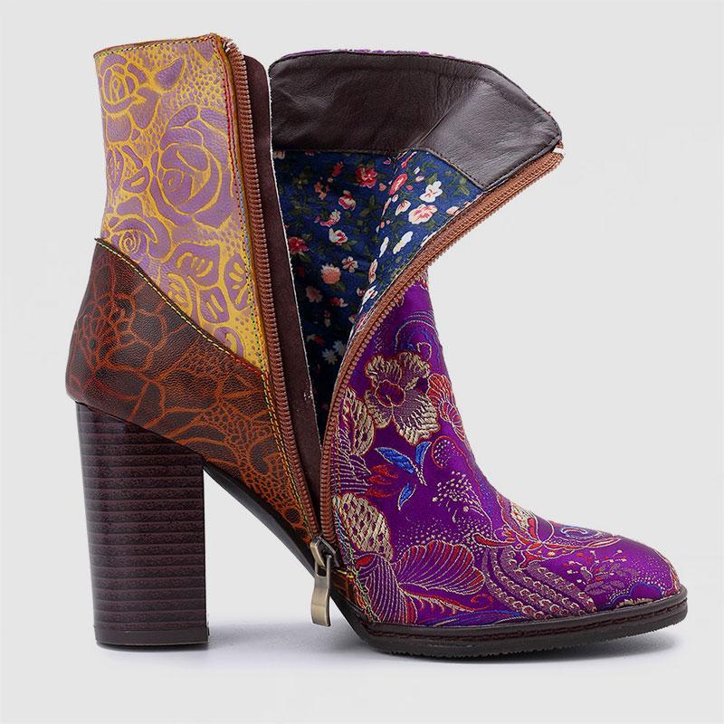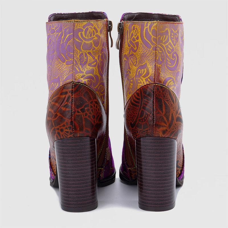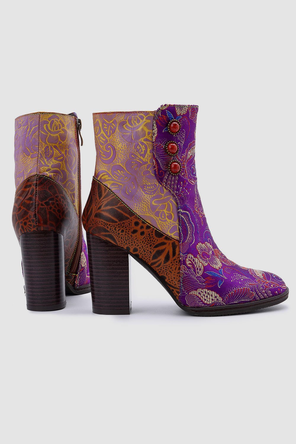 Retro Vintage Printed Leather Block High Heels Ankle Boots