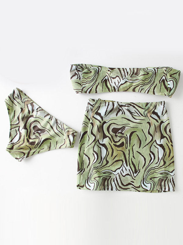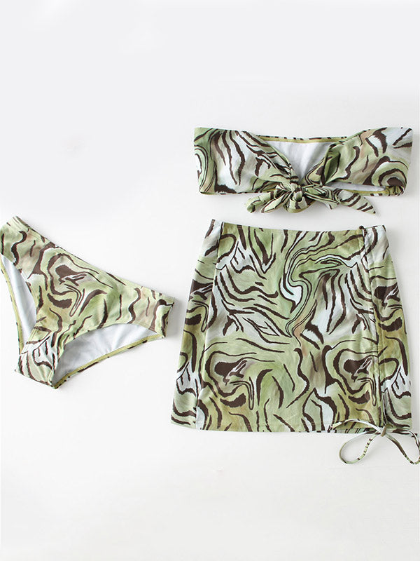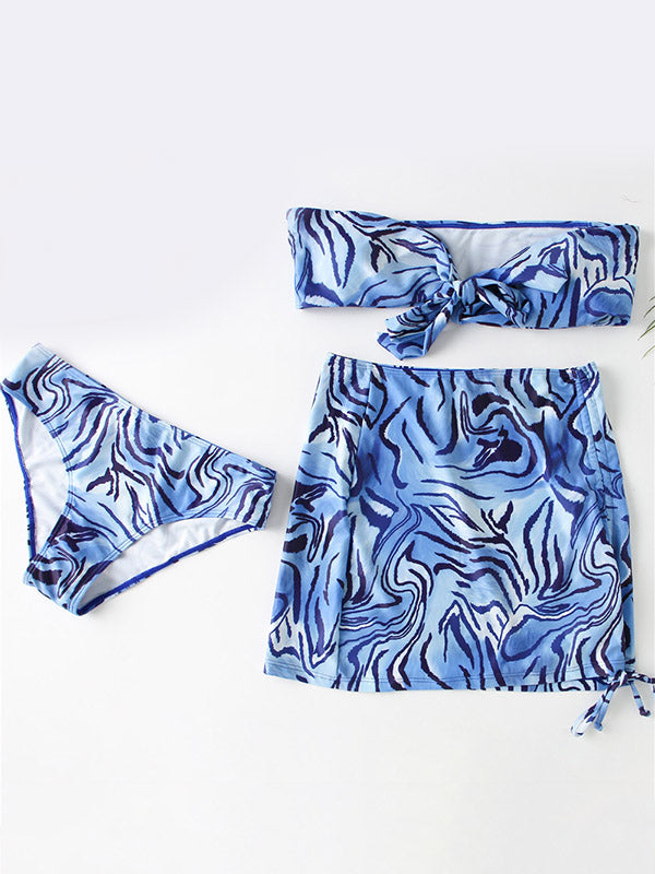 Ripple Printed Padded Bikini Swimwear+Drawstring Cover-Ups Skirt Three-Pieces Set