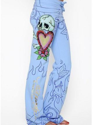 Rose Skull Pattern Hem Wide Leg Bottom Casual Pants