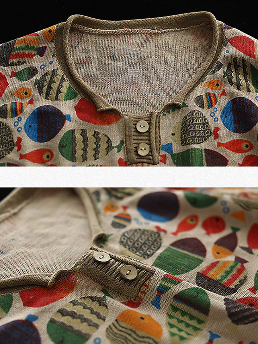 Plus Size Round Neck Fish Print Knitted T-Shirt