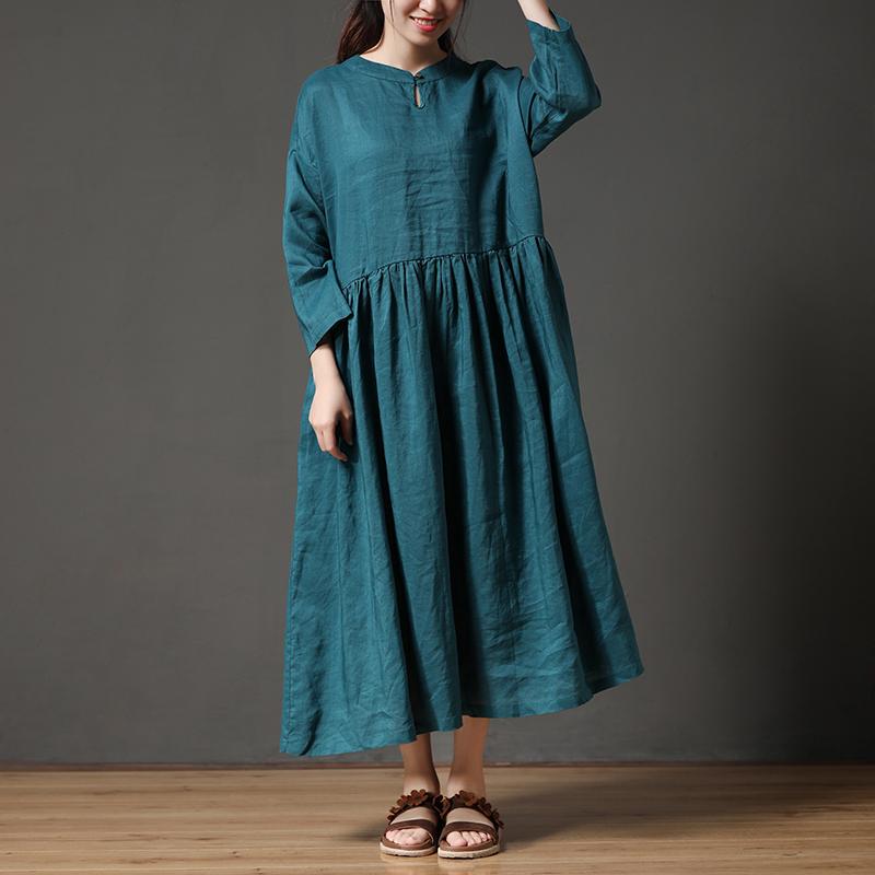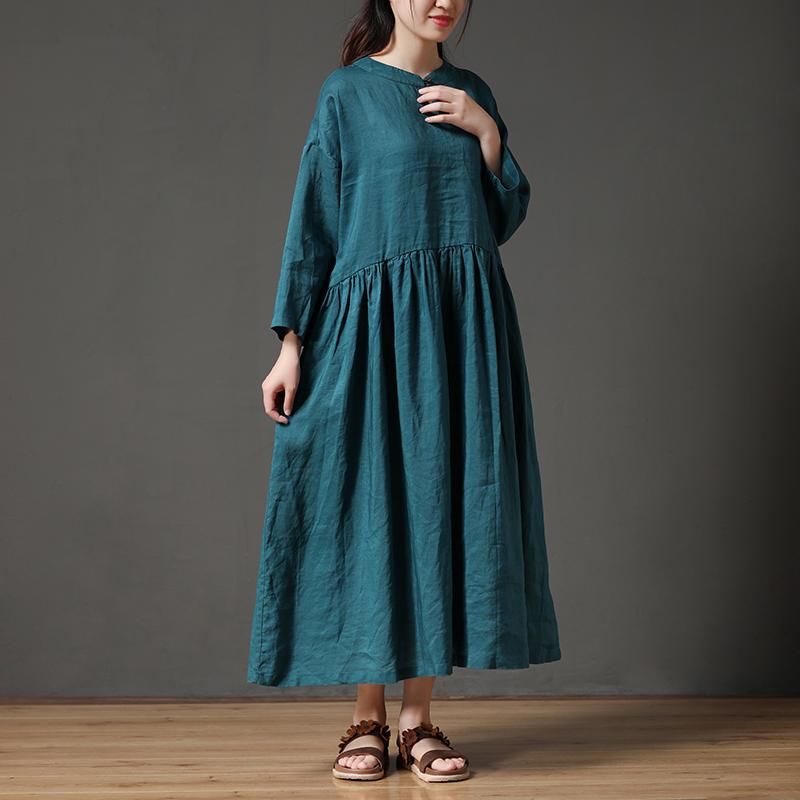 Round Neck Hollow Cotton Linen Green Loose Women Dress