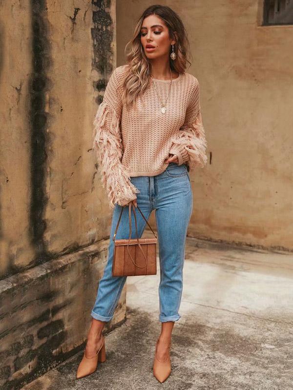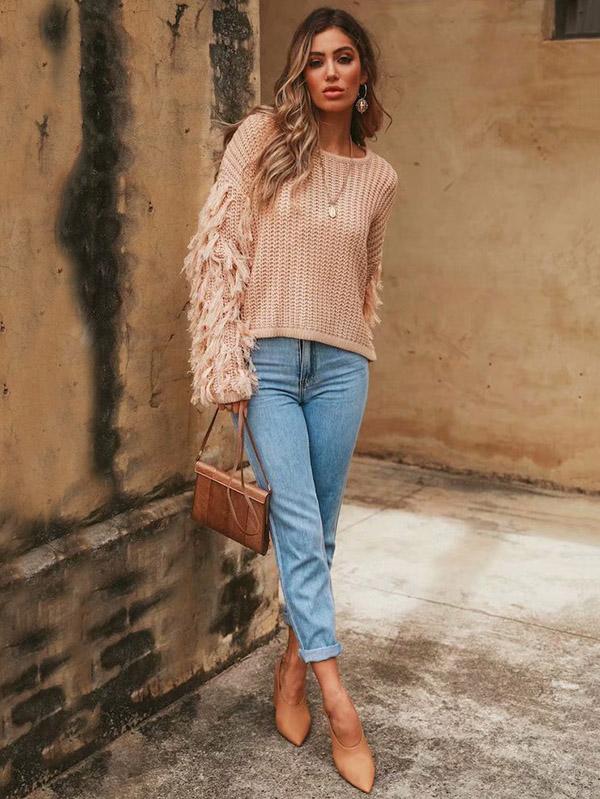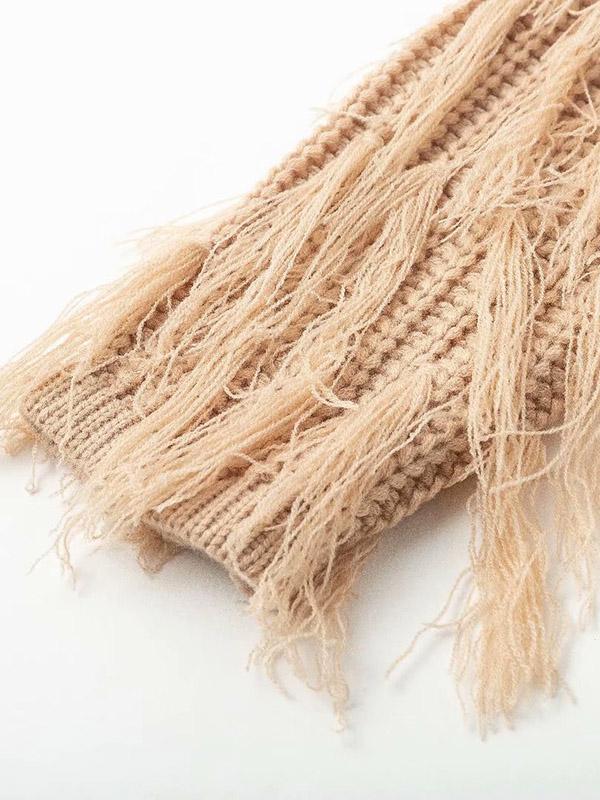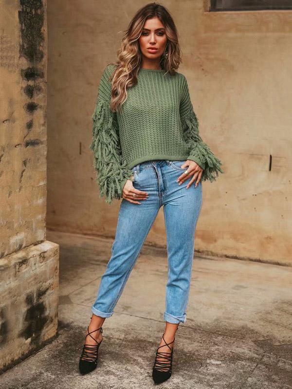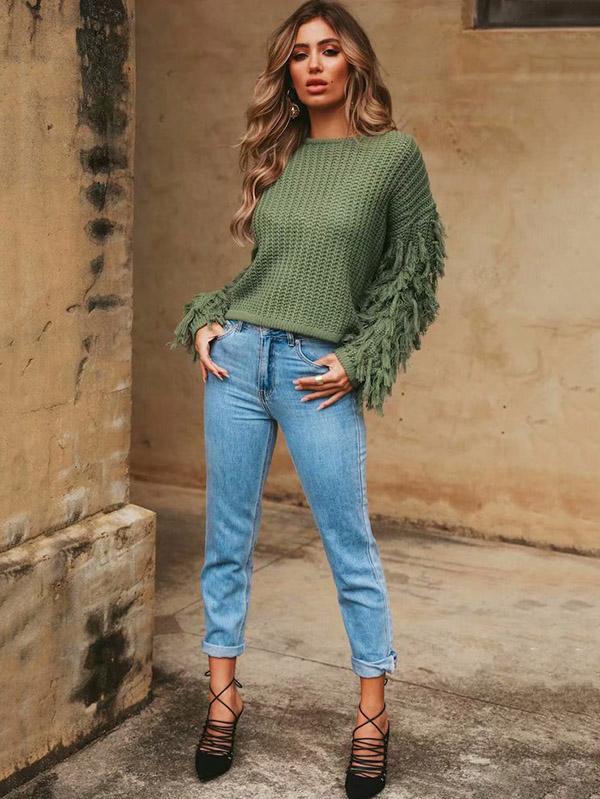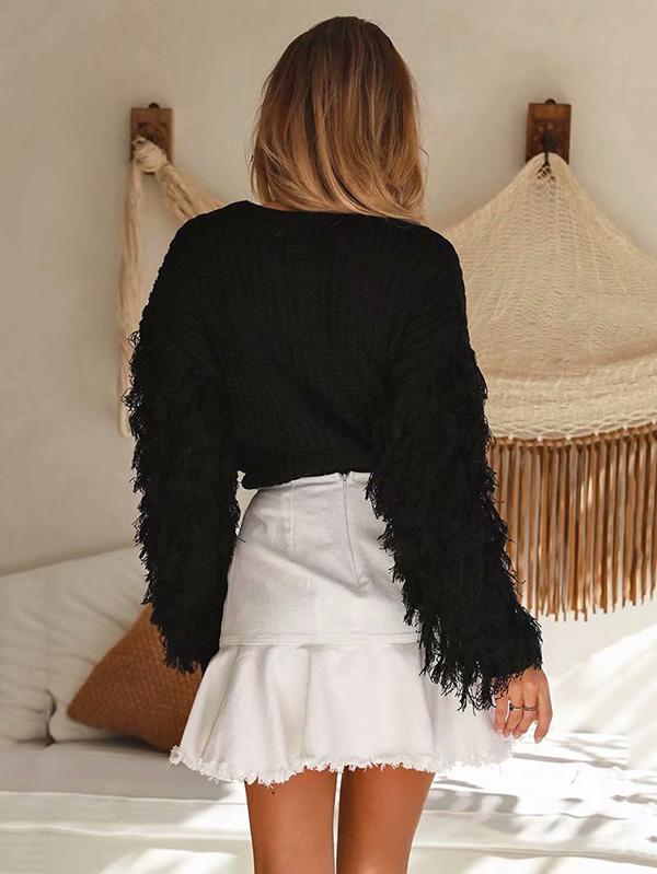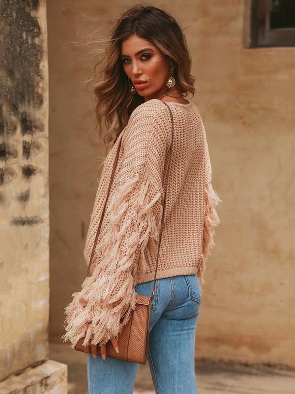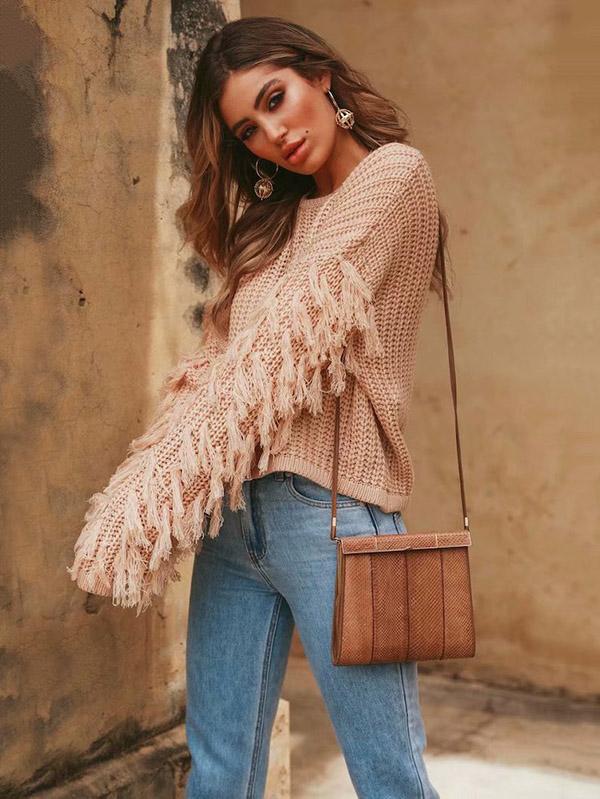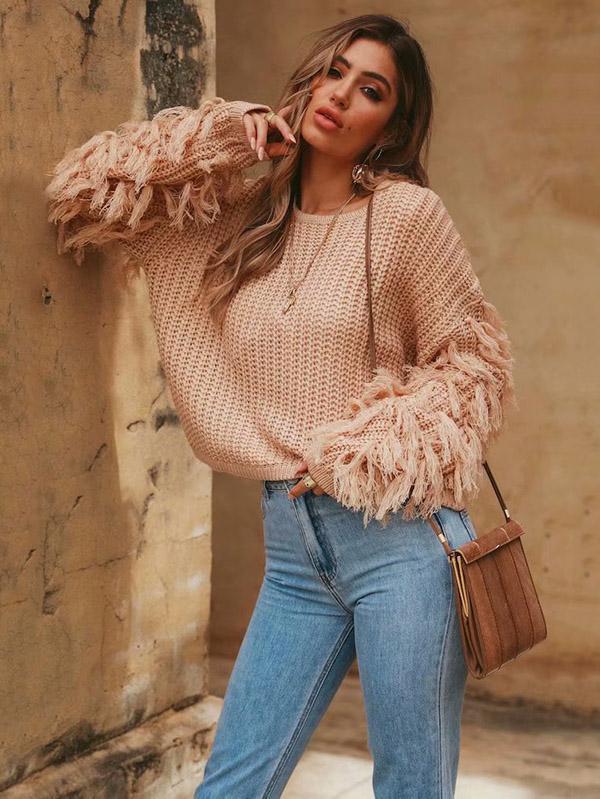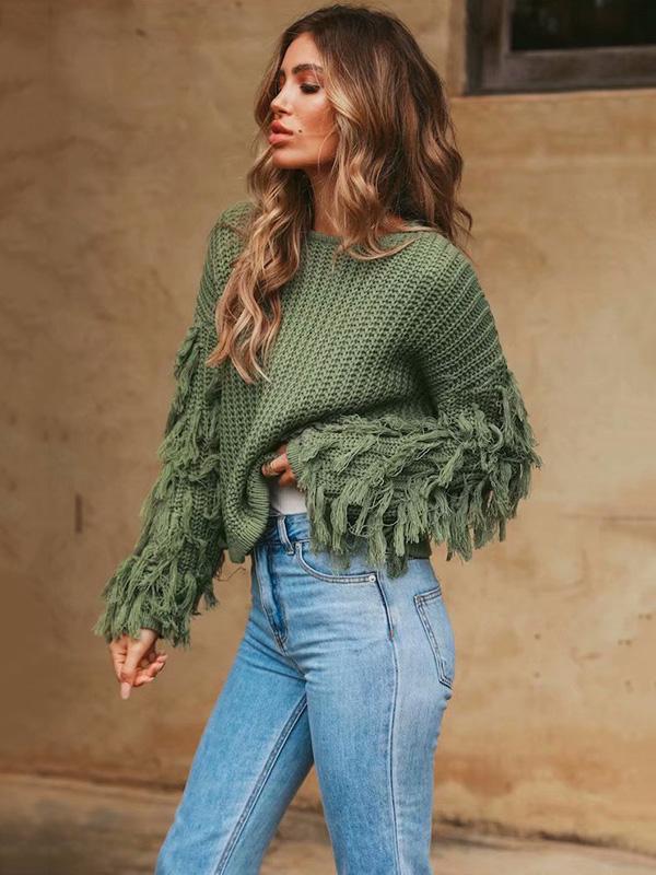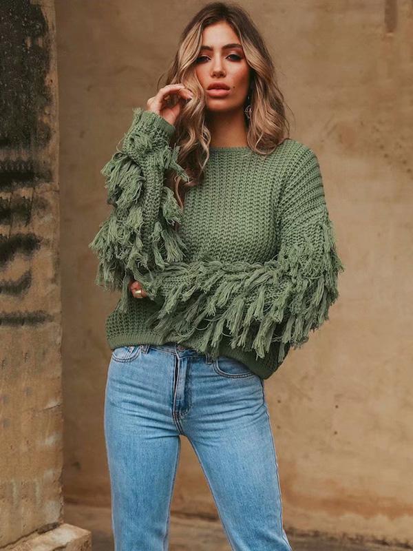 Round-neck Long Sleeves Tasseles Sweater Tops