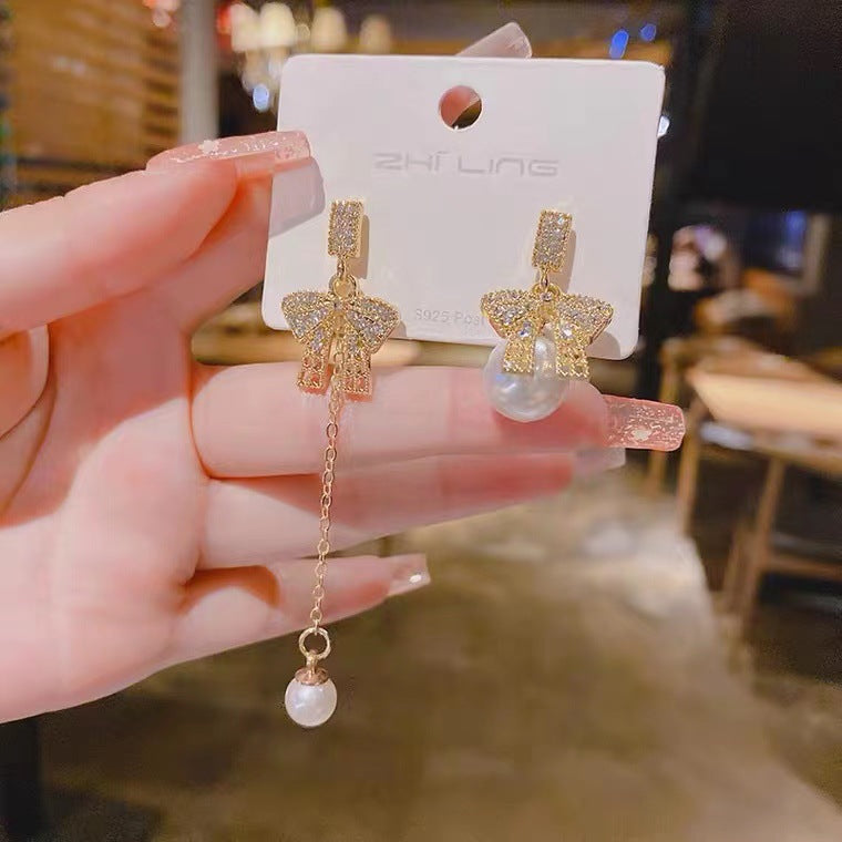 S925 Silver Needle Pearl tassel openwork asymmetric bow long earrings