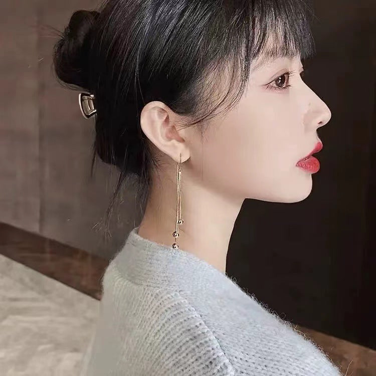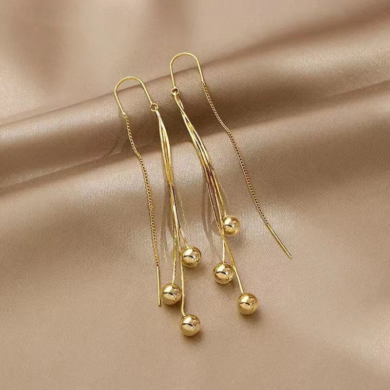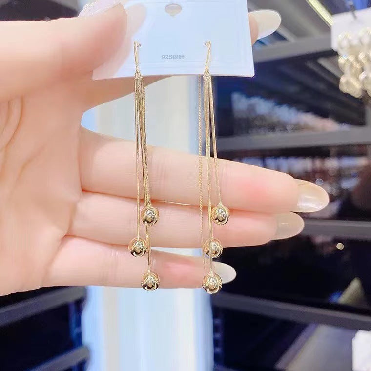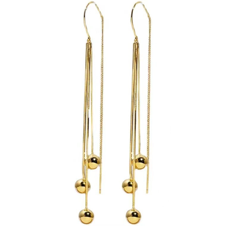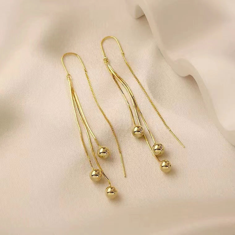 S925 silver needle tassel long small gold bead earrings