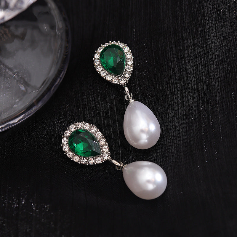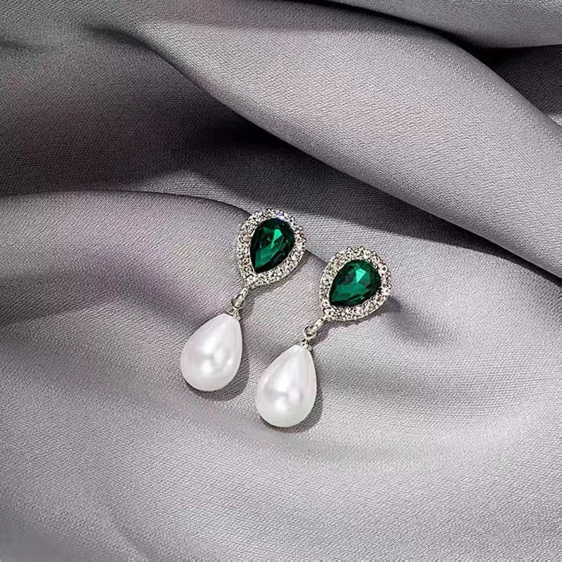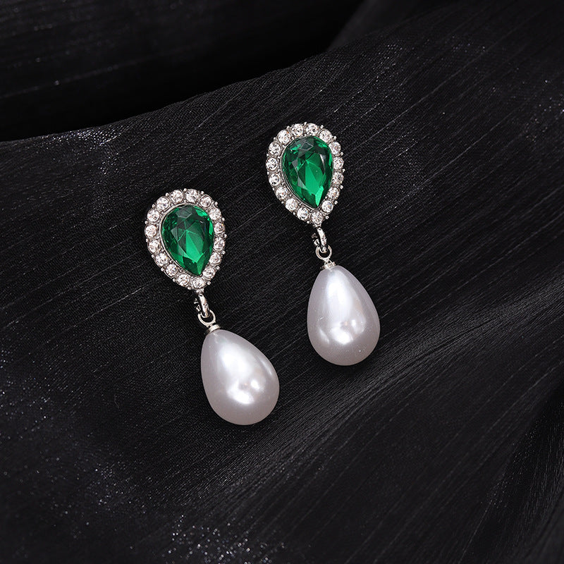 S925 silver needle vintage pearl diamond emerald earrings