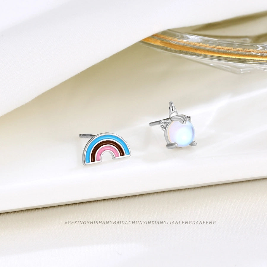 s925 Sterling Silver Rainbow Moonstone stud earrings elegant niche cute jewelry small asymmetric earrings for women