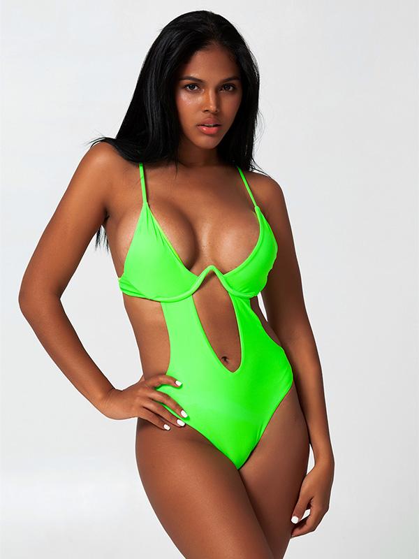 Sexy Deep V-Neck Padded Hollow One-Piece Bikini Swimwear