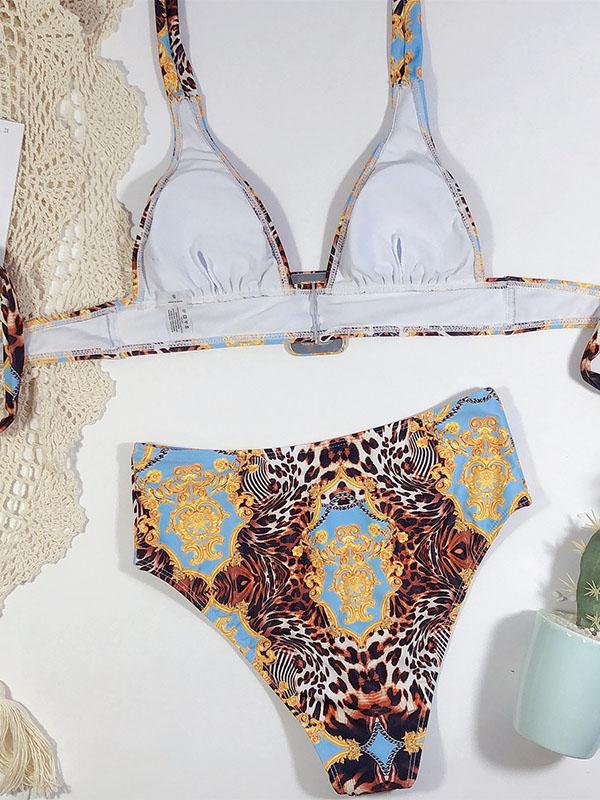 Sexy Deep V-Neck Printing Bandage Split Bikini Swimsuit