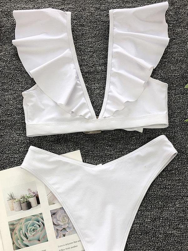 Sexy Flounces V-Neck Metal Buckle Split Bikini Swimsuit