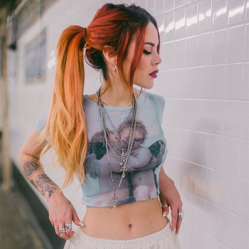 Sexy mesh cutout cute angel print short T-shirt tight bottoming shirt ACTIVEWEAR