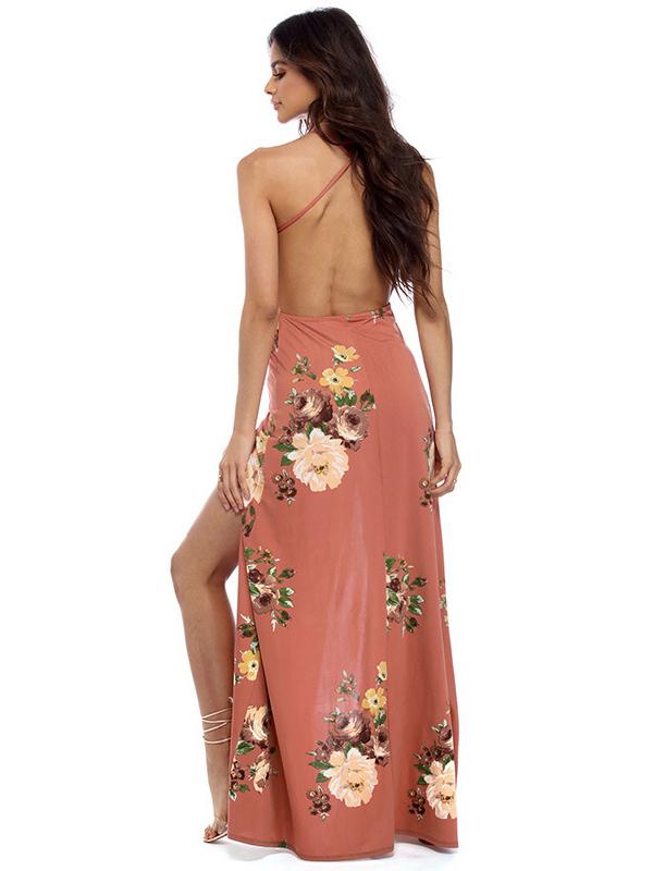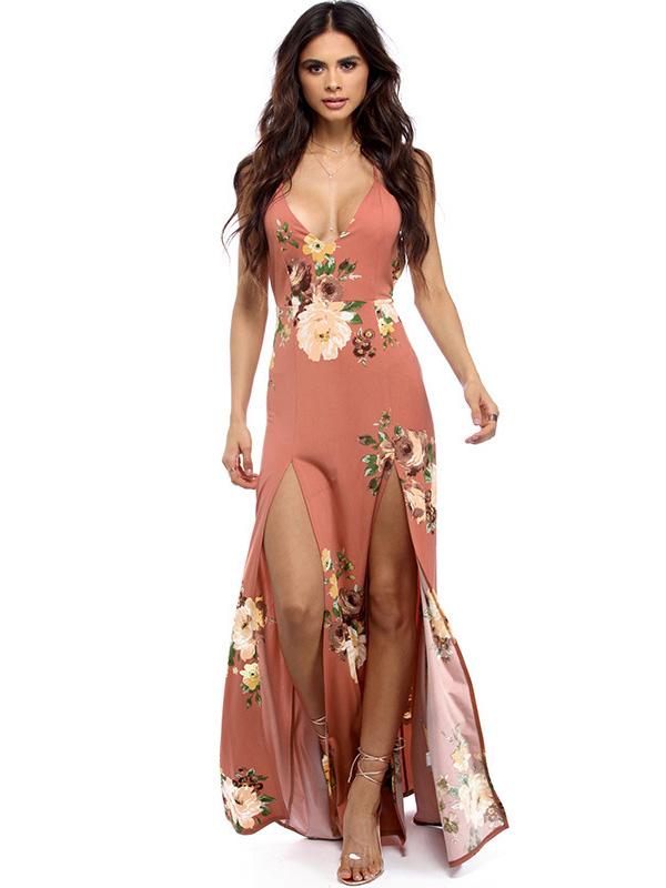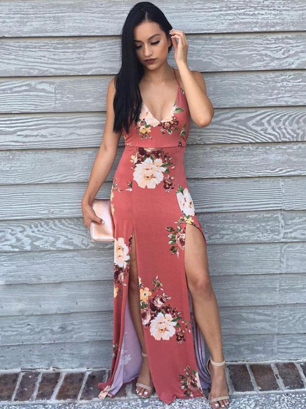 Sexy V-Neck Printed Spaghetti-Neck Split-Front Maxi Dresses