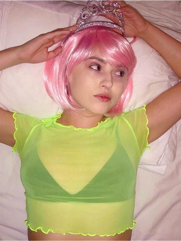 Sheer Neon Frilled Cropped T-Shirt Tops