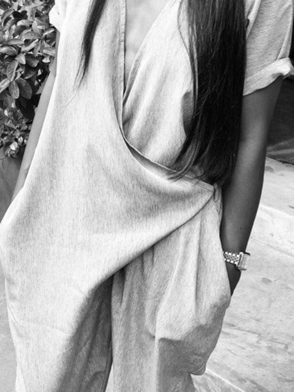 Short Sleeves V-neck Solid Color Floral Jumpsuits