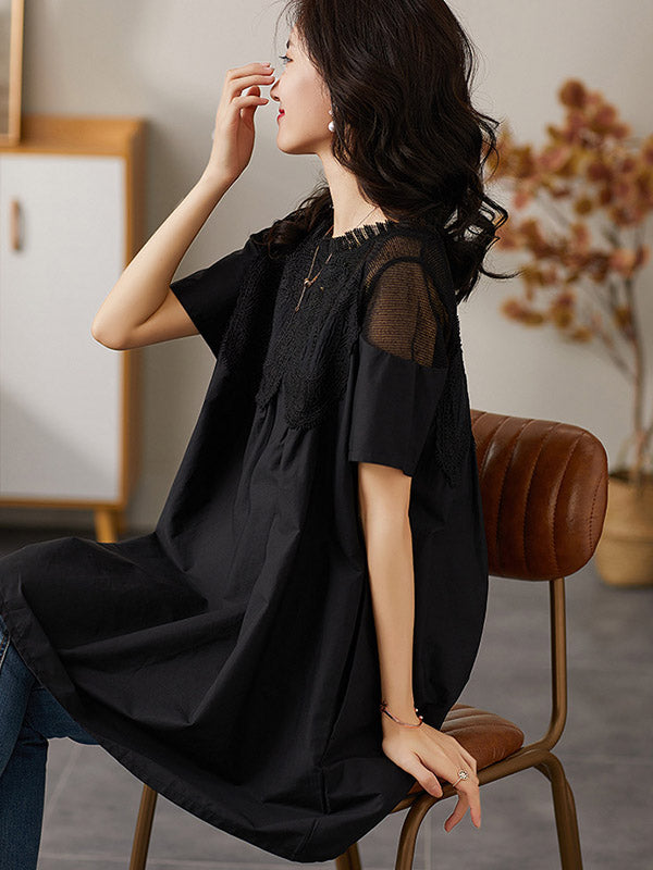 Simple Loose Solid Color Split-Joint Embroidered Hollow Lace Pleated Round-Neck Short Sleeves T-Shirt