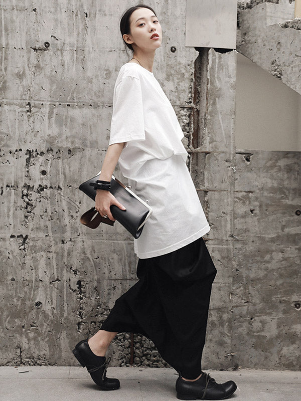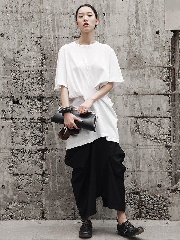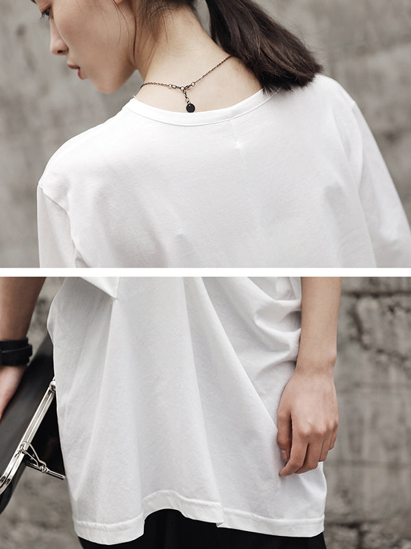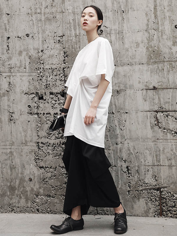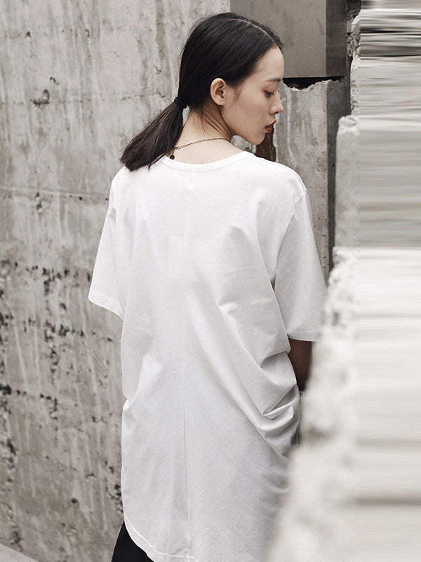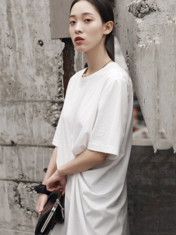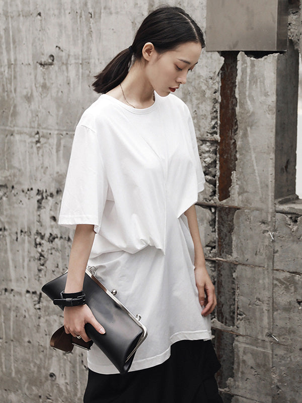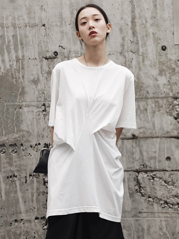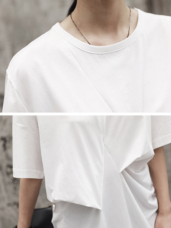 Simple Solid Color Asymmetric Pleated Short Sleeves Round-Neck T-Shirt