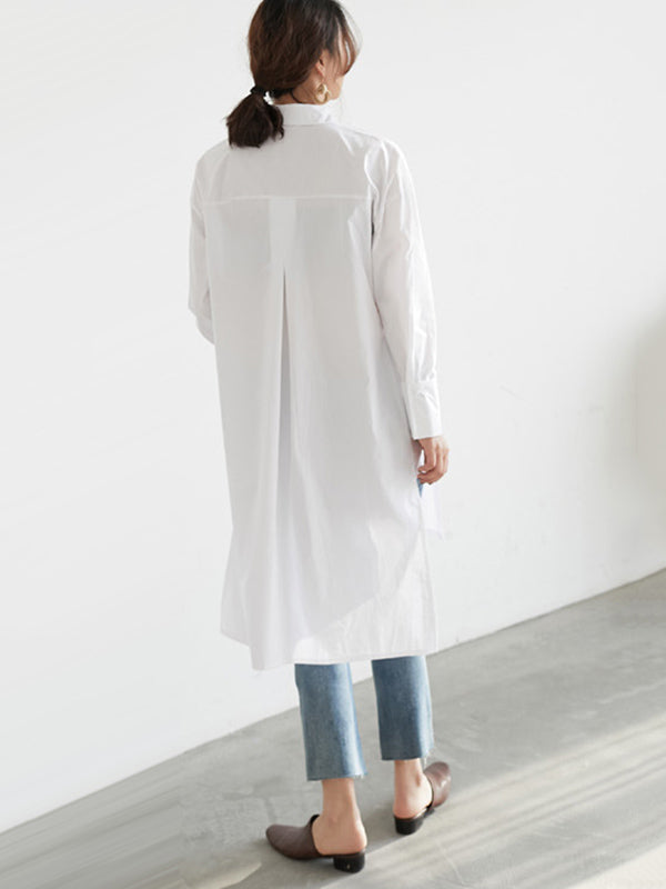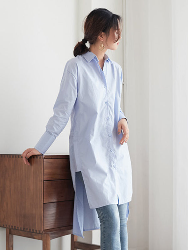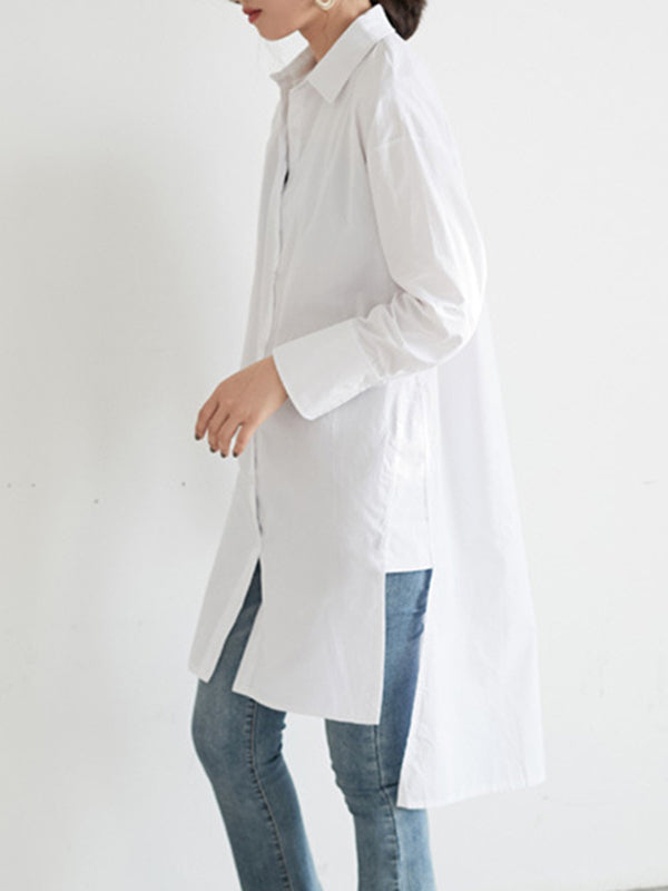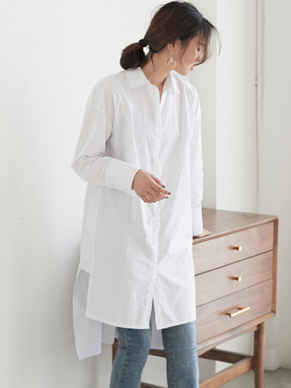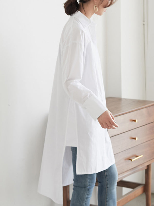 Simple Solid Color Buttoned Split-Side Lapel Collar Long Sleeves Blouse