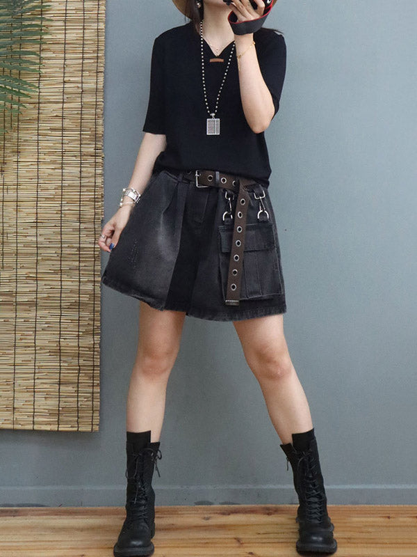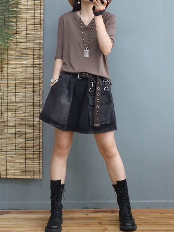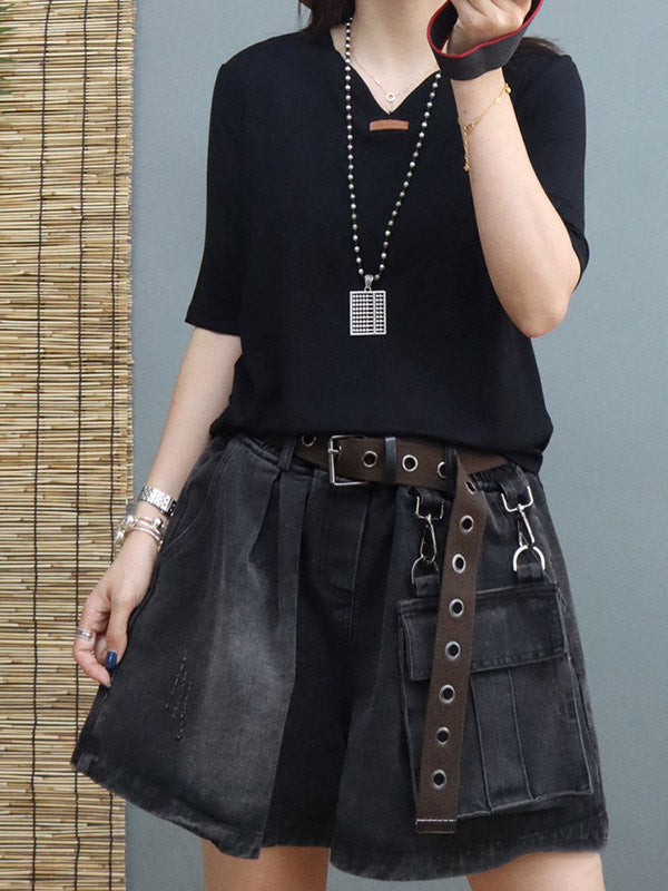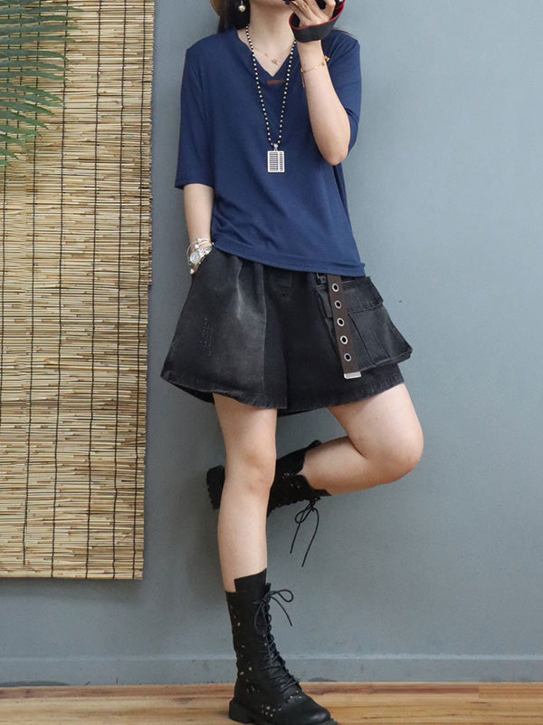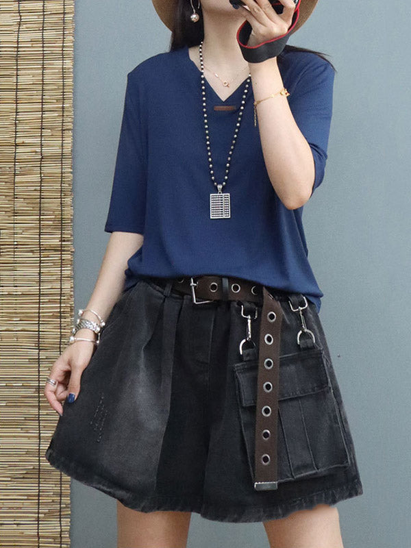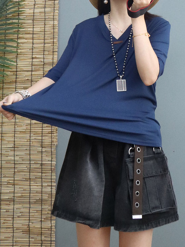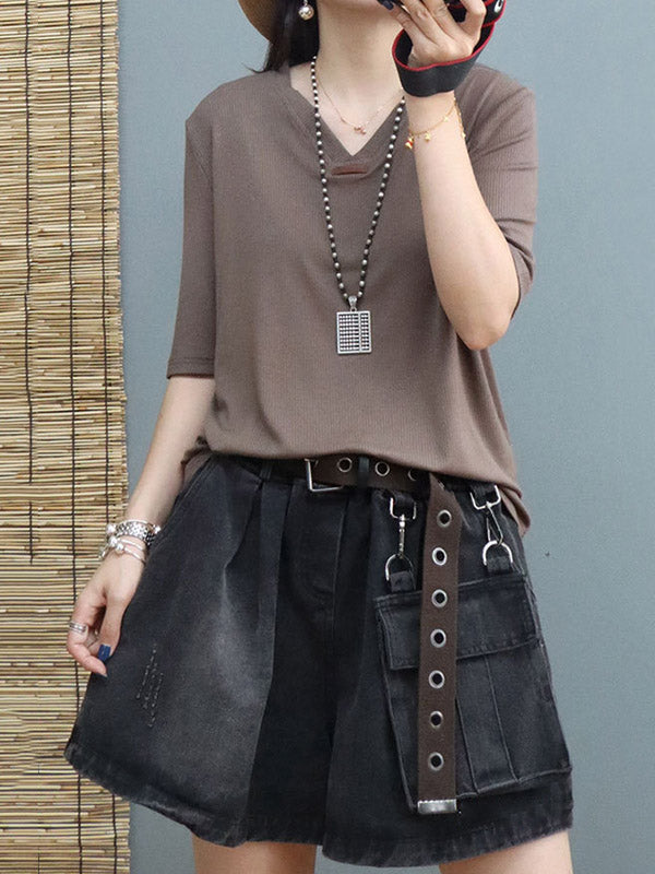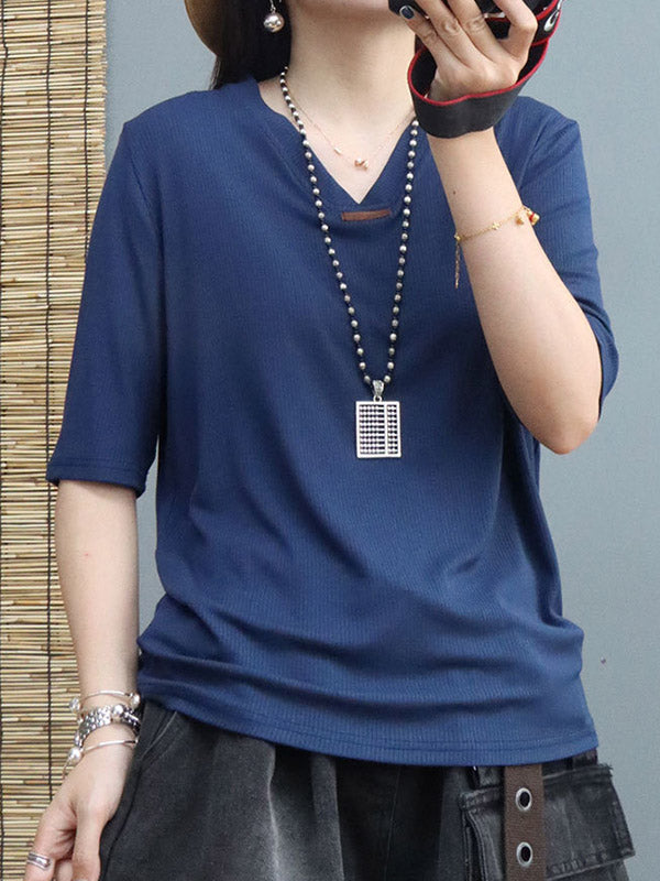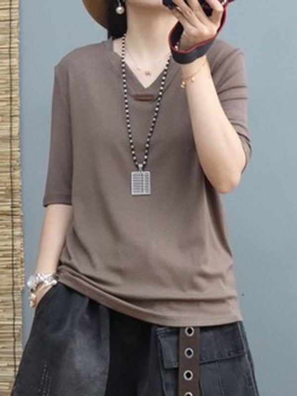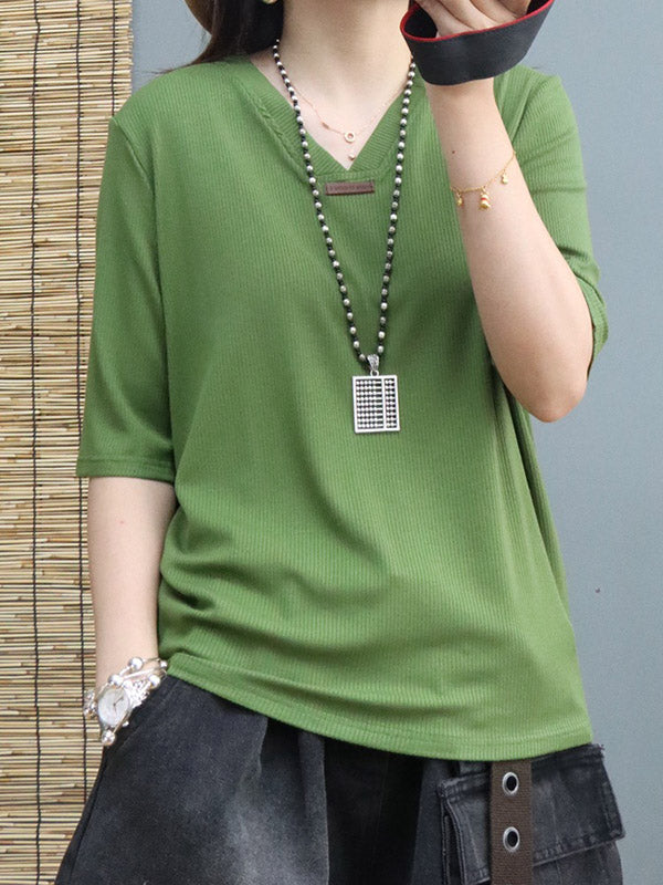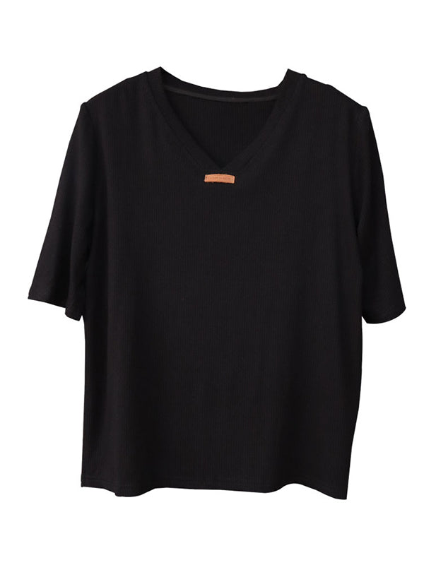 Simple Solid Color V-Neck Short Sleeves T-Shirt Tops