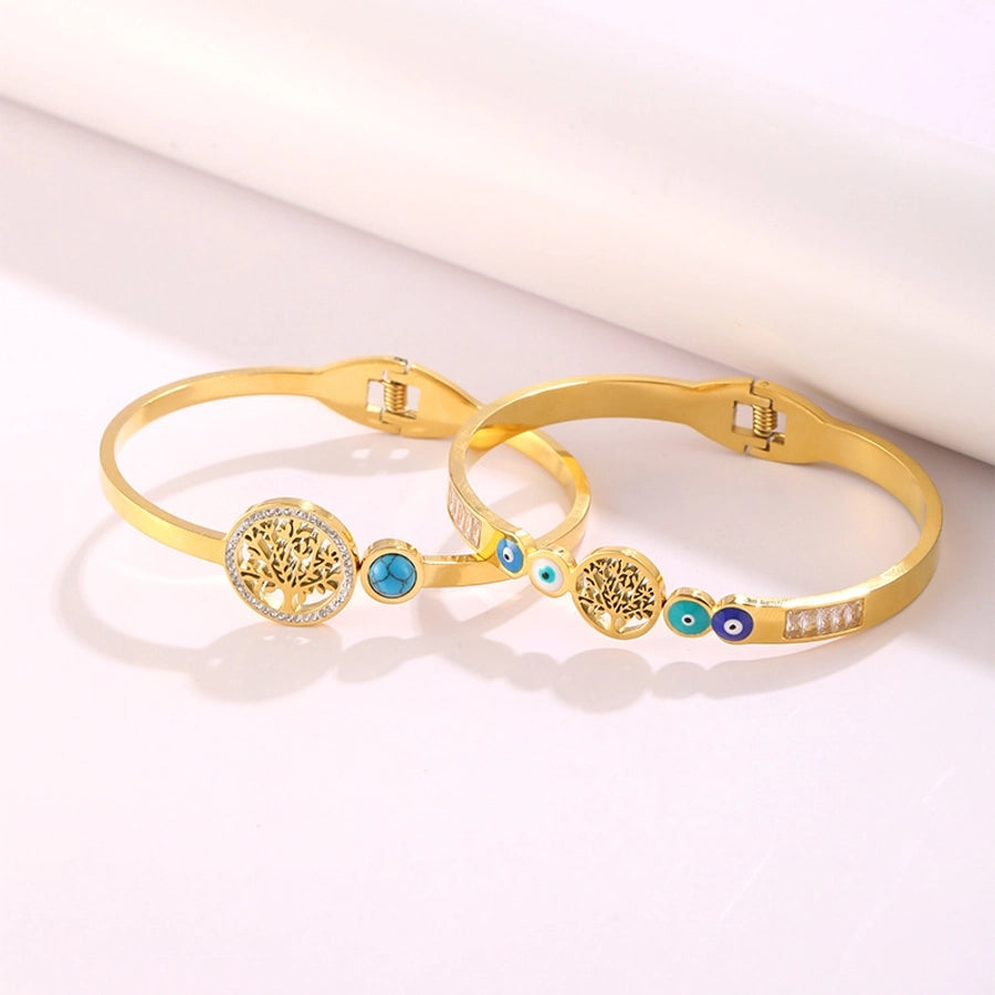 Simple Style Life Tree Eye 304 Stainless Steel 18K Gold Plated Turquoise Rhinestones Bangle In Bulk Stainless Steel Bracelets