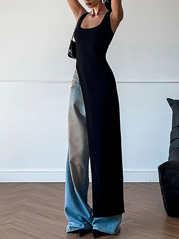 Skinny Sleeveless Asymmetric Solid Color Split-Side Square-Neck Tank Top