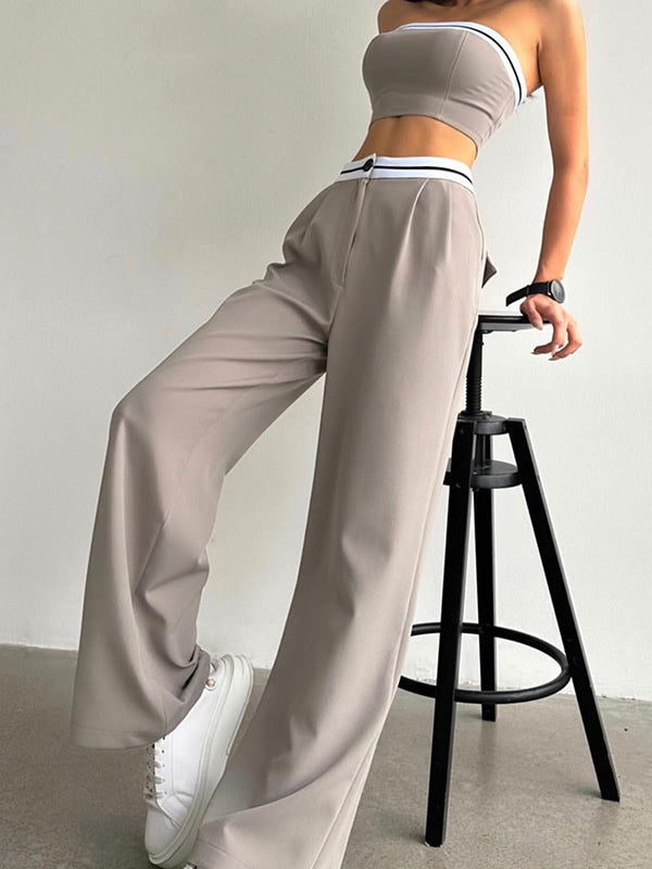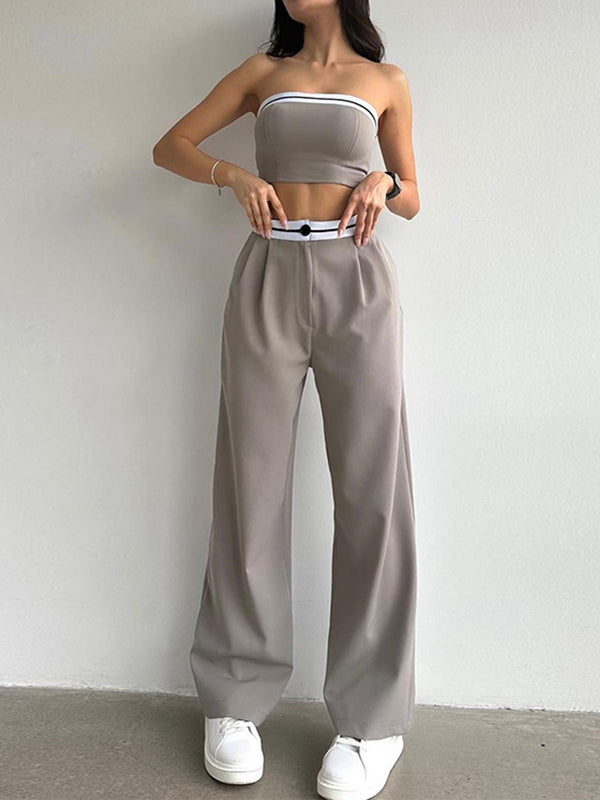 Sleeveless Contrast Color Tube Tube Top + High Waisted Pleated Buttoned Pants Bottom Two Pieces Set