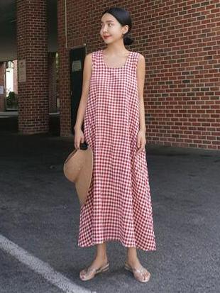 Sleeveless Plaid Loose Plus Size Midi Dresses