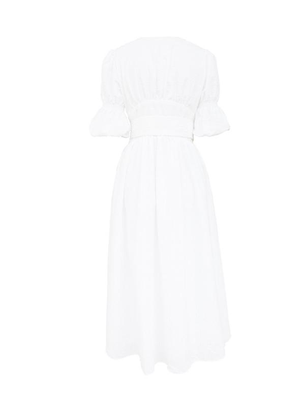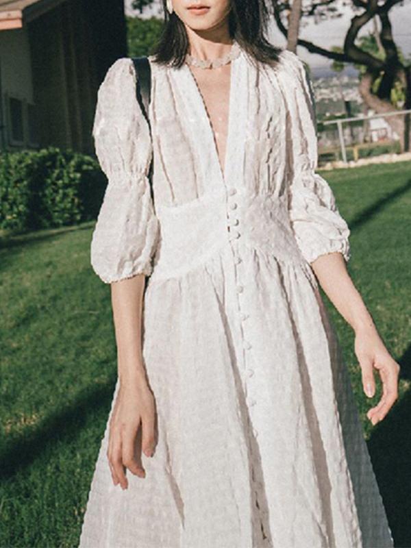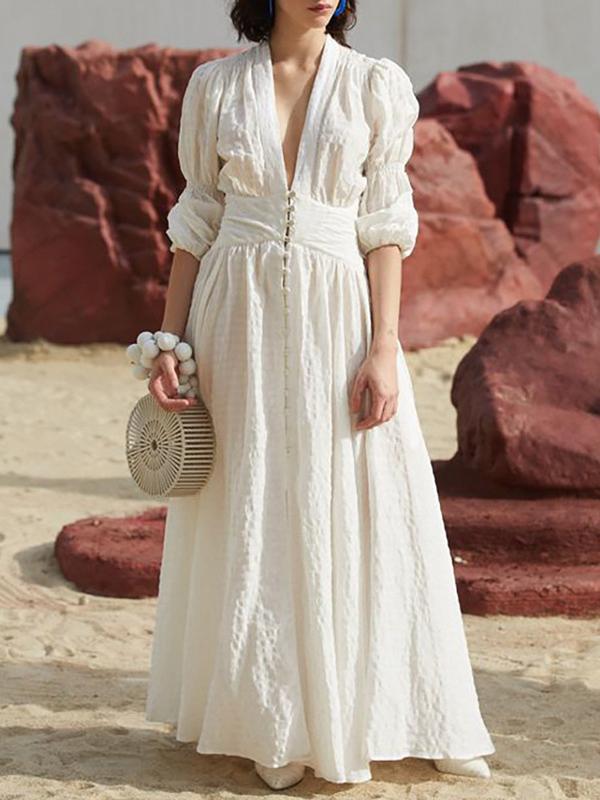 Solid Color Drape Short Bubble Sleeves Maxi Dress