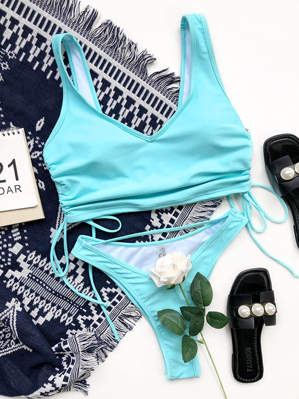 Solid Color Drawstring U-Neck Bikini Swimwear