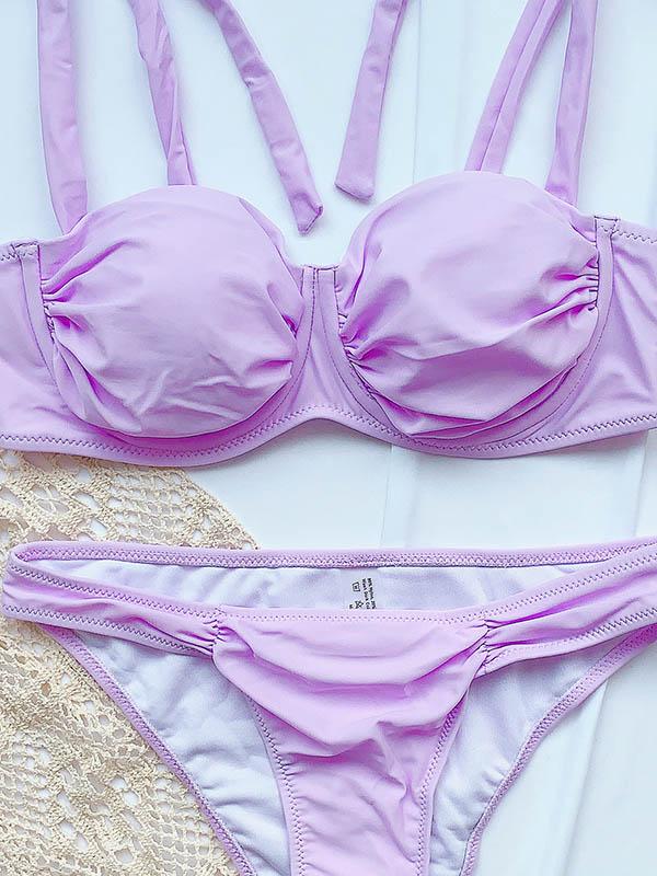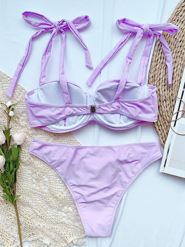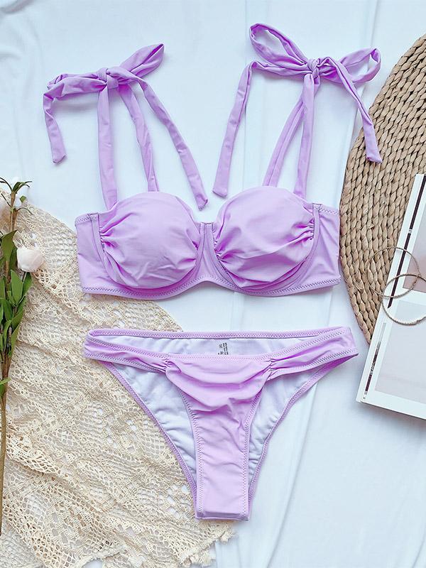 Solid Color Fold Knotted Bandeau Underwired Split Bikini Swimsuit