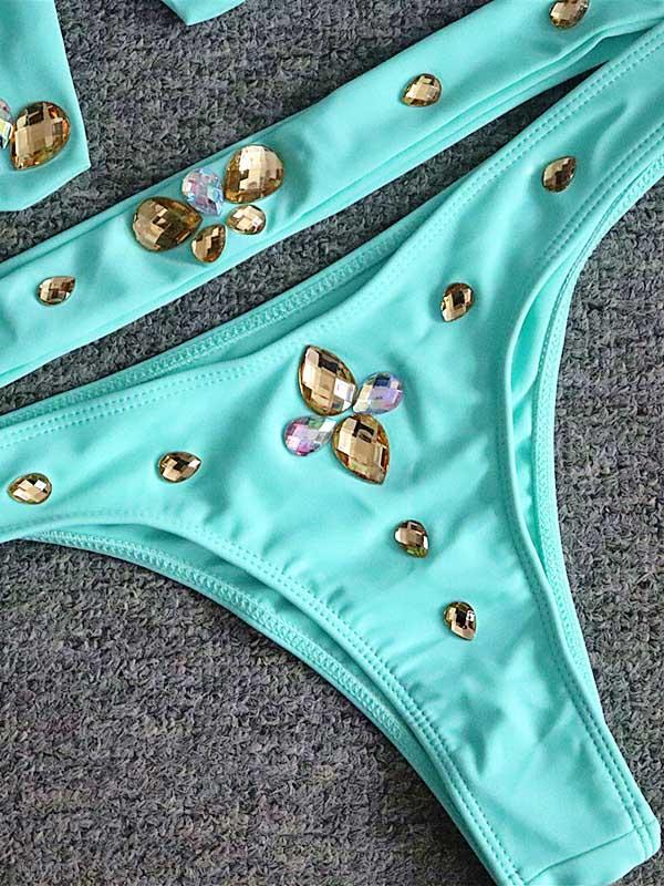 Solid Color Hot Drill Knotted Split Bikini Swimsuit