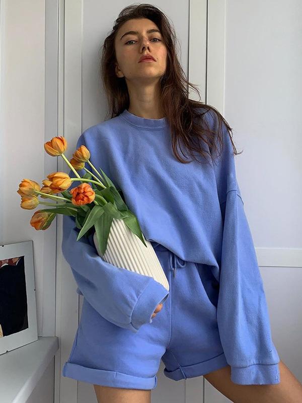 Solid Color Loose Long Sleeves Tees&Shorts Suits