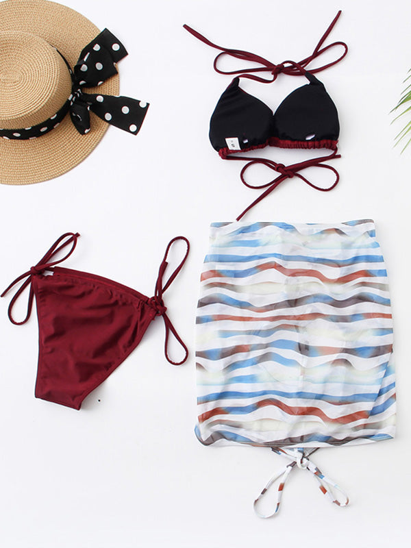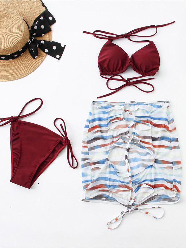 Solid Color Tie-Side Bikini Swimwear+Hollow Drawstring Skirt Cover-Ups Three-Pieces Set