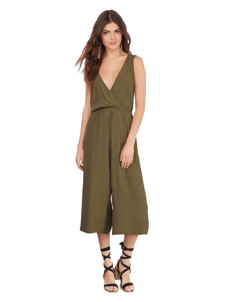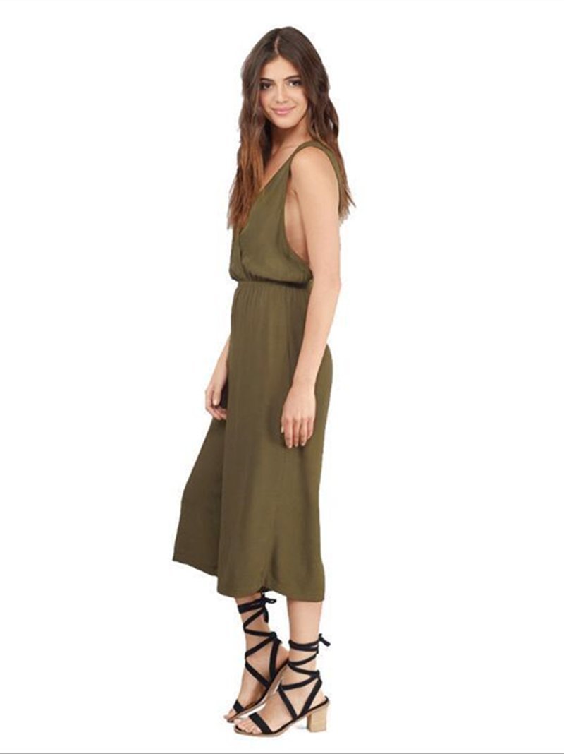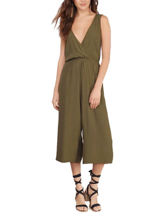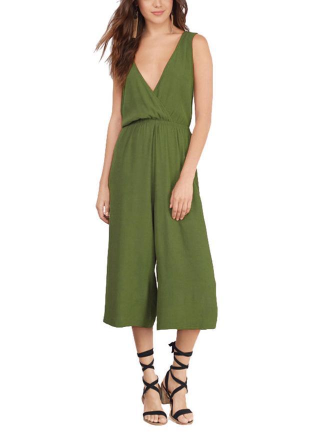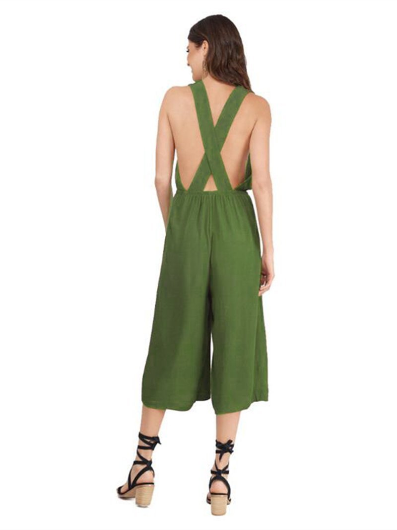Solid Color V-neck Backless Wide Leg Jumpsuits Bottoms