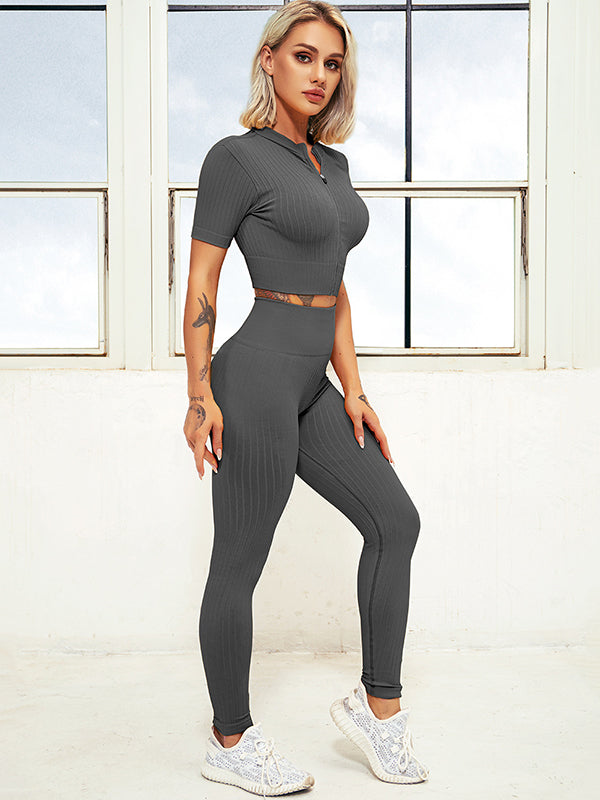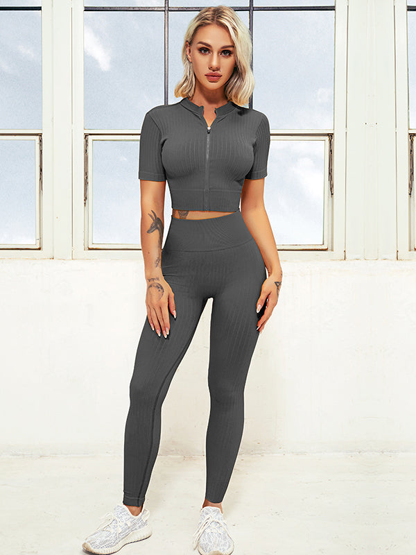 Solid Color Zipper Half Sleeves Tees&Leggings Suits