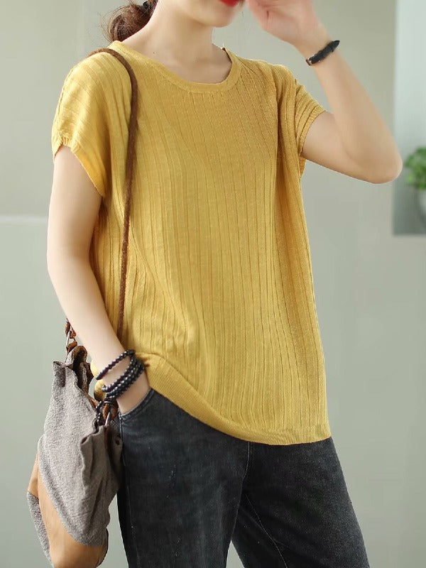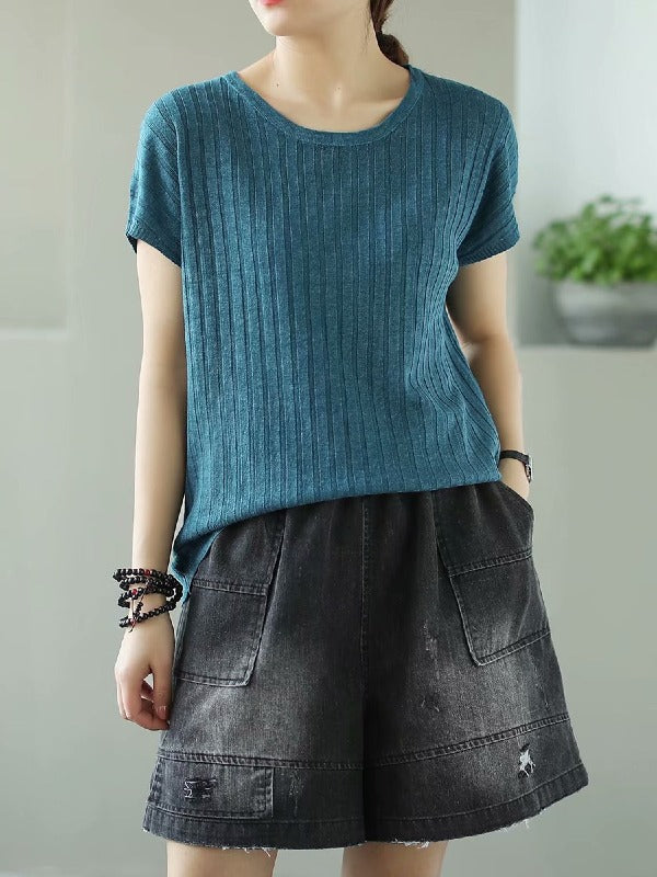 SOLID KNITTING STRIPES ROUND-NECK T-SHIRT