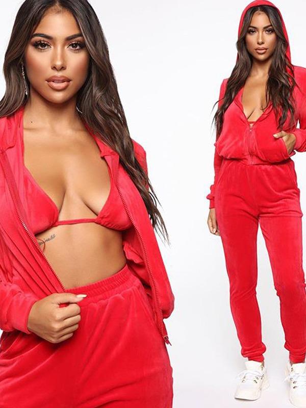 Solid Plush Zipper Hoodies&Pants Sports Suits ACTIVE WEAR