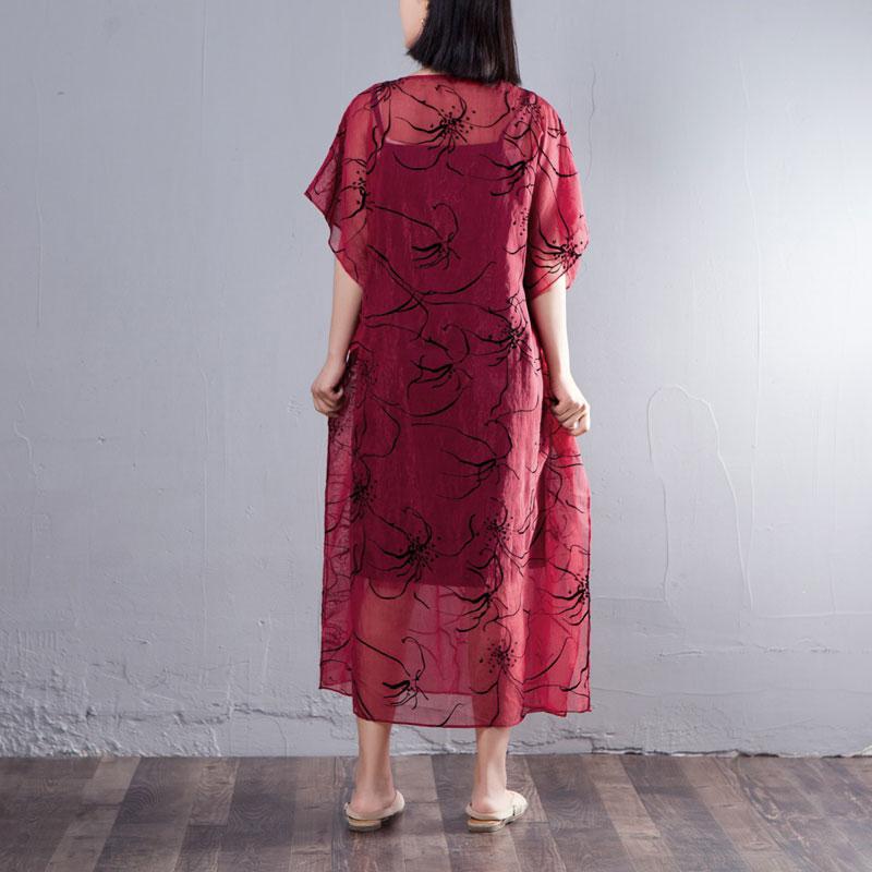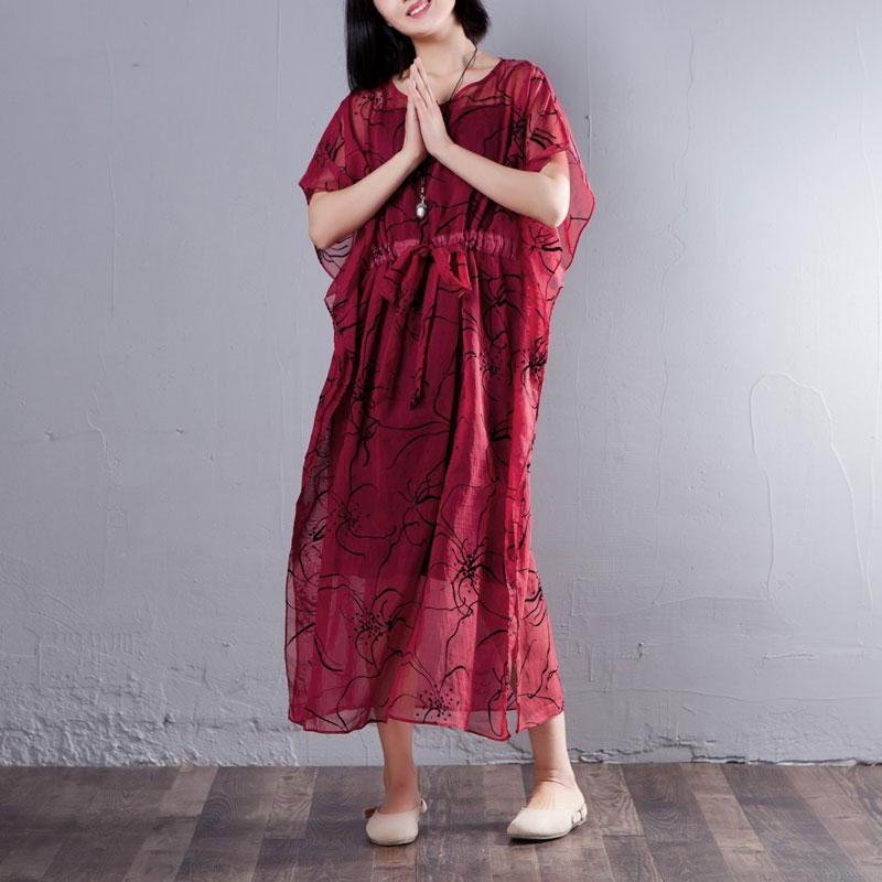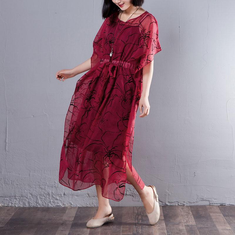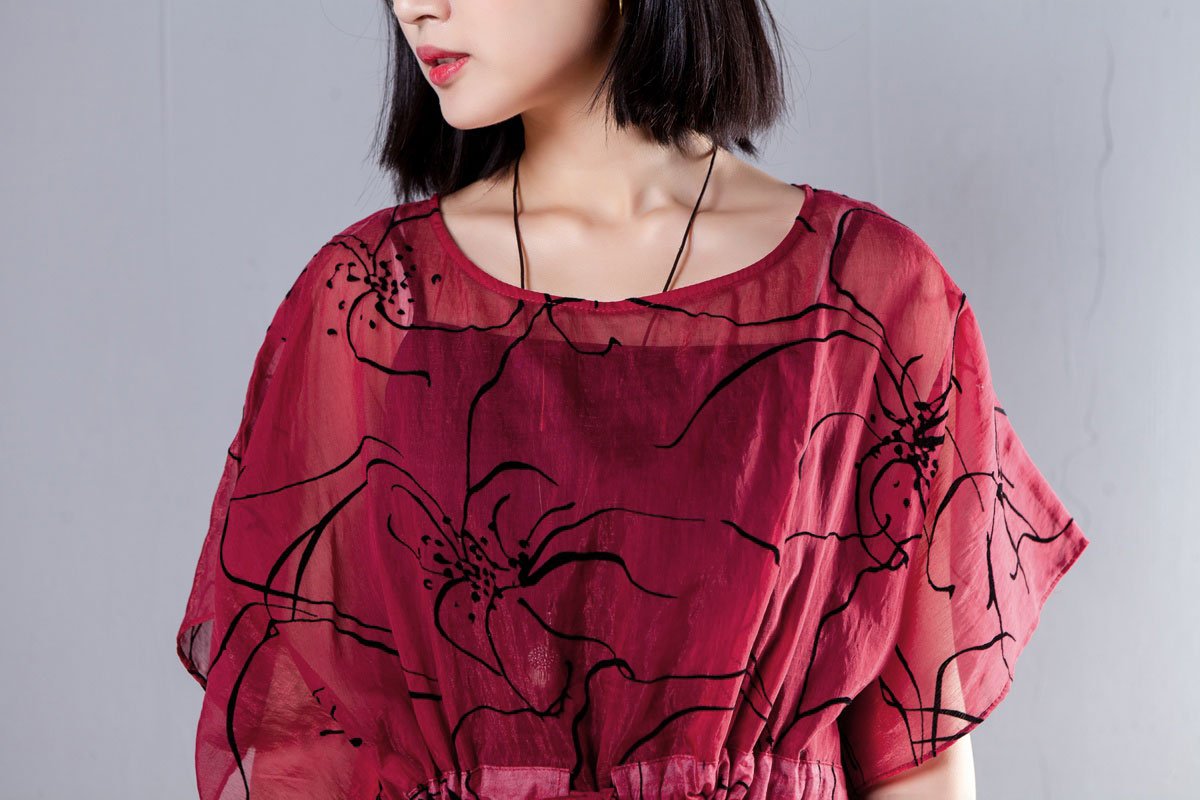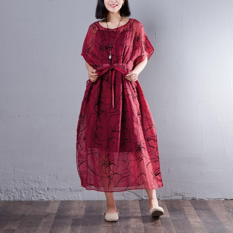 Spring Summer Round Neck Short Sleeve Printed Red Dress