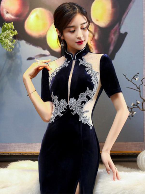 Stand Collar Beaded Split-side Corduroy Long Cheongsam