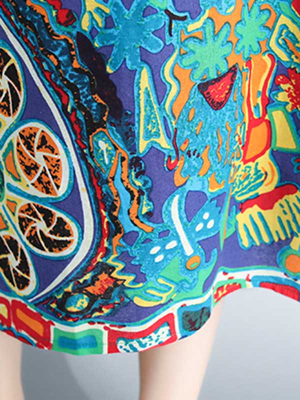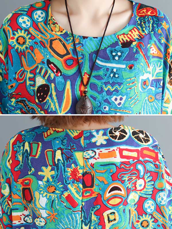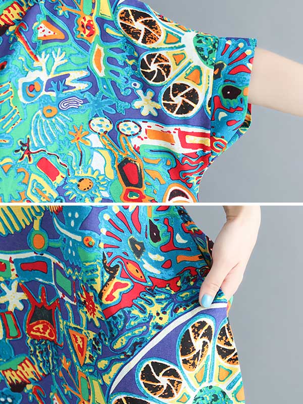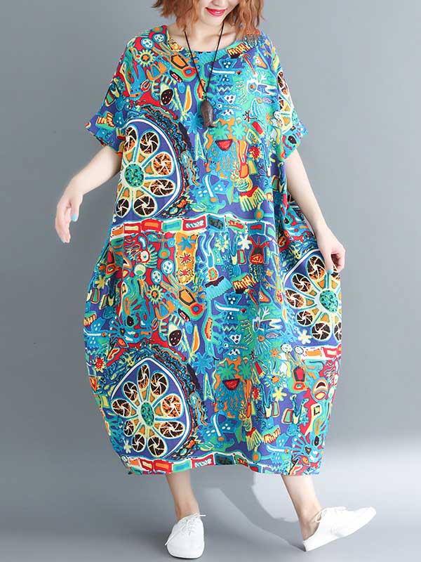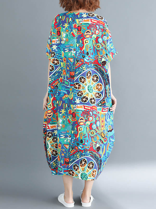 Stylish Asymmetric Printed Round-Neck Loose Batwing Sleeve Midi Dress
