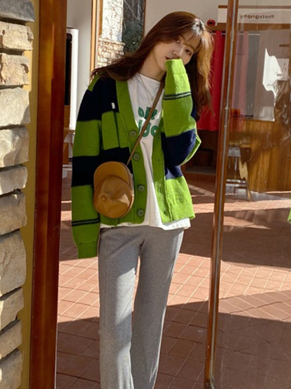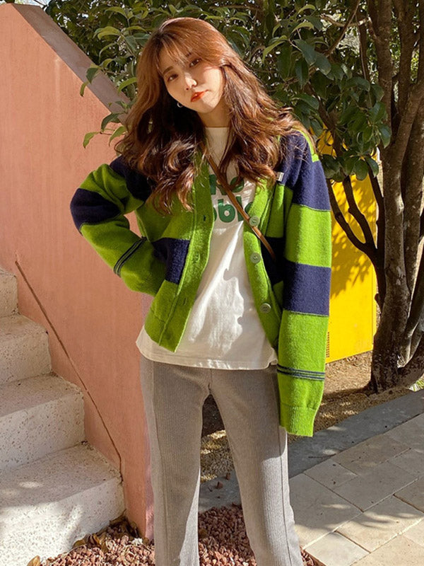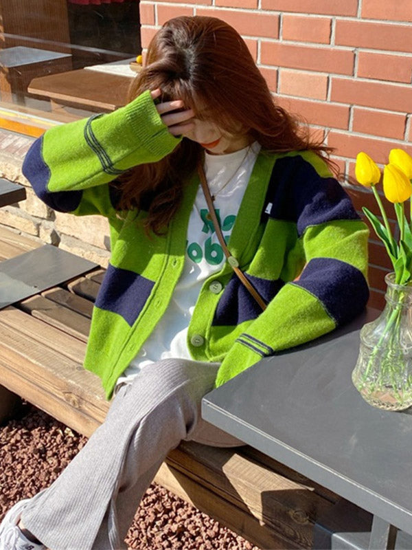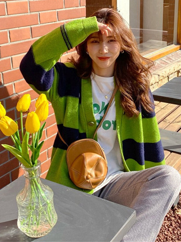 Stylish Buttoned Contrast Color Striped V-Neck Long Sleeves Cardigans Outerwear