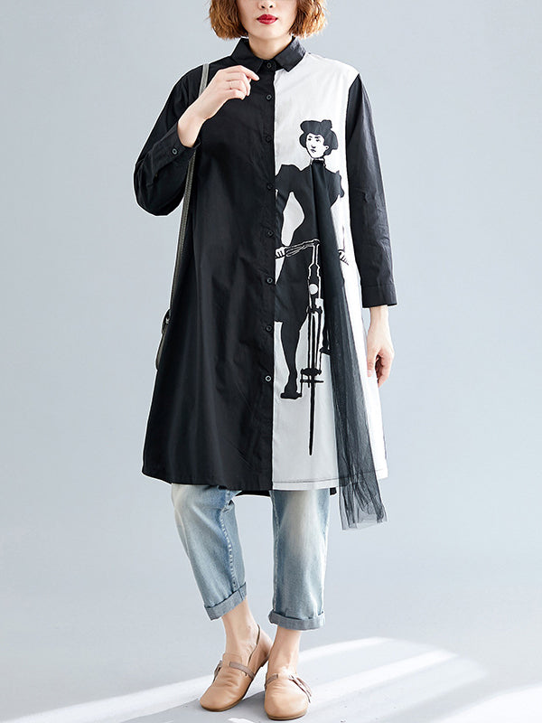 Stylish Contrast Color Printed Split-Joint Lapel Long Sleeves Blouse Dress