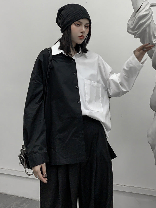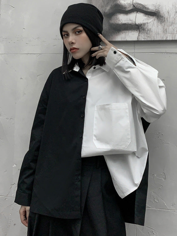 Stylish Contrast Color Split-Joint With Pocket Buttoned Lapel Color Long Sleeves Blouse