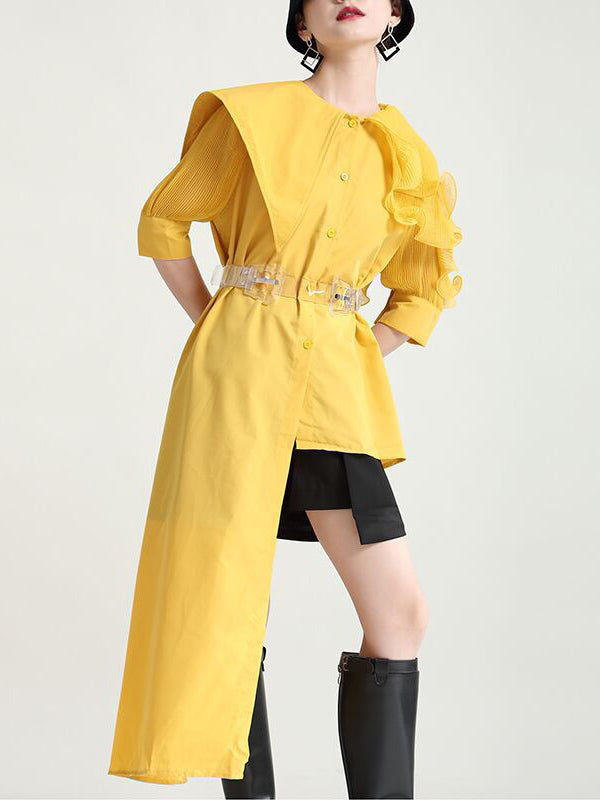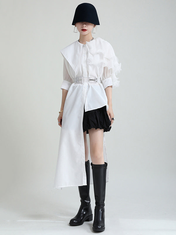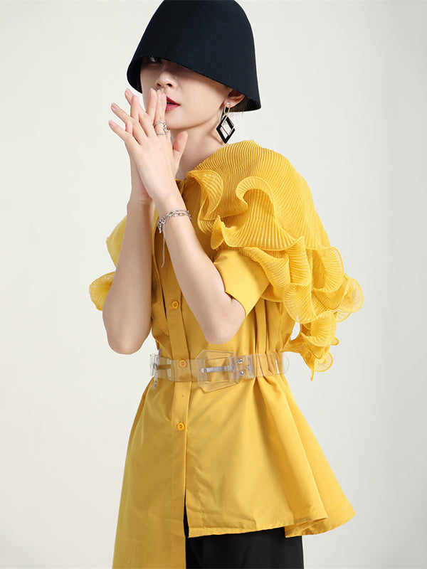 Stylish Irregular 4 Colors Split-Joint Pleated Mesh Falbala Buttoned Lapel Collar Bishop Sleeves Blouse