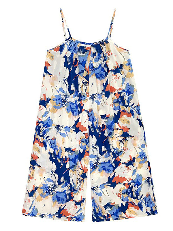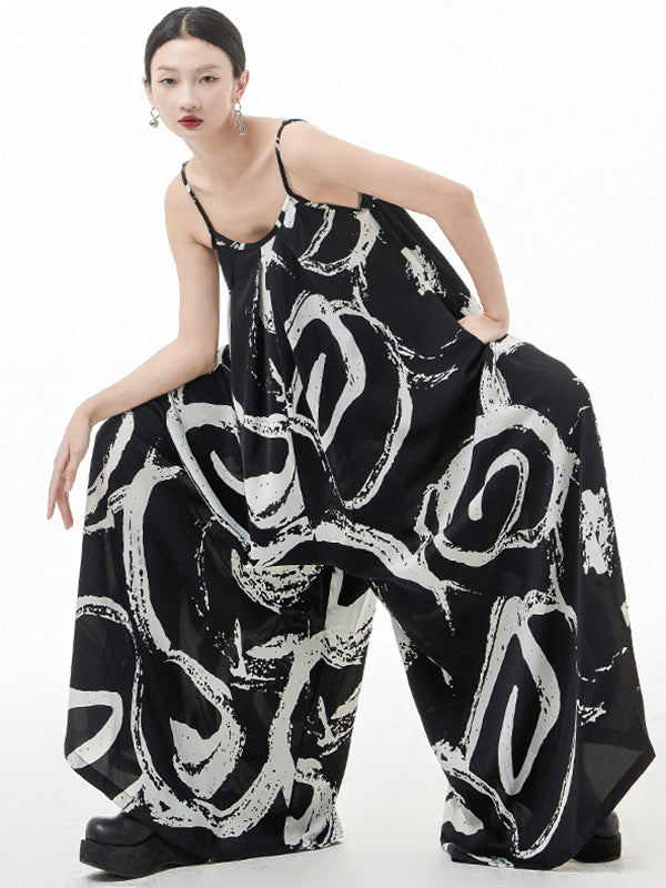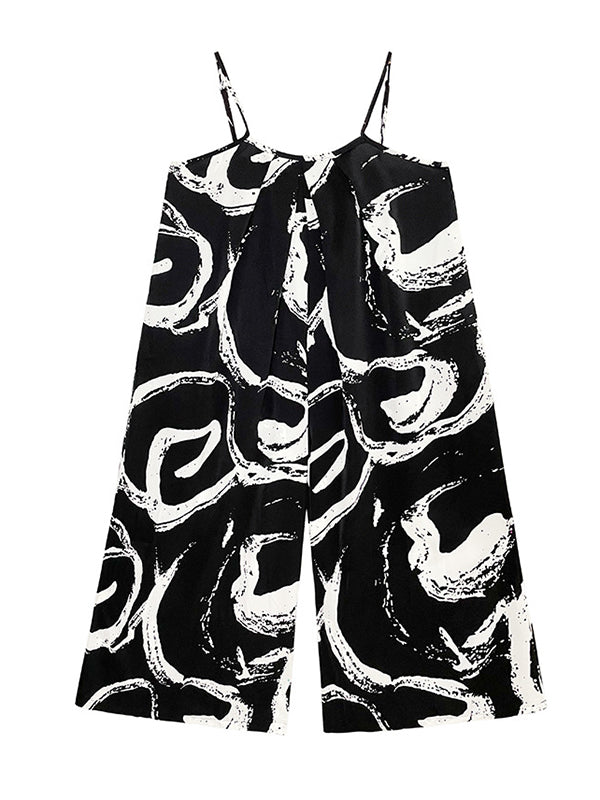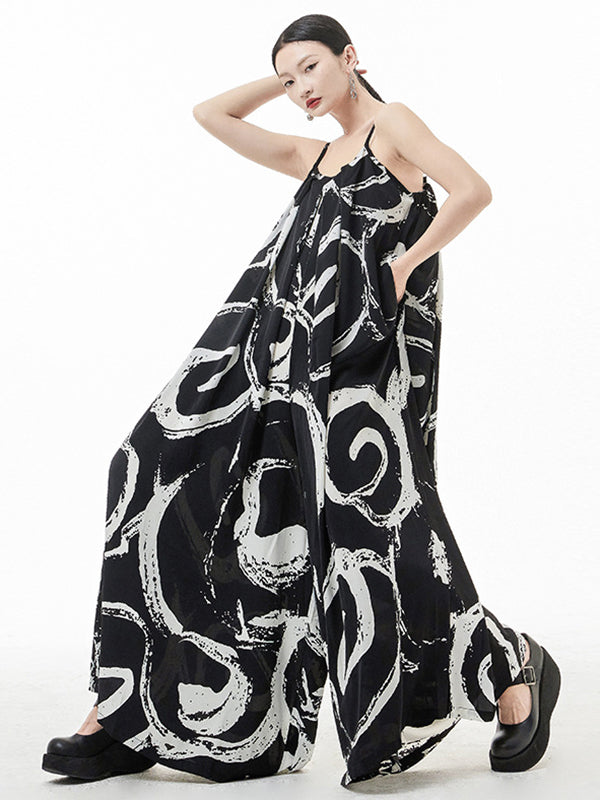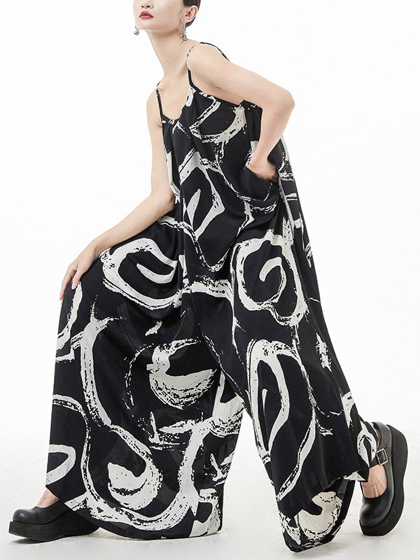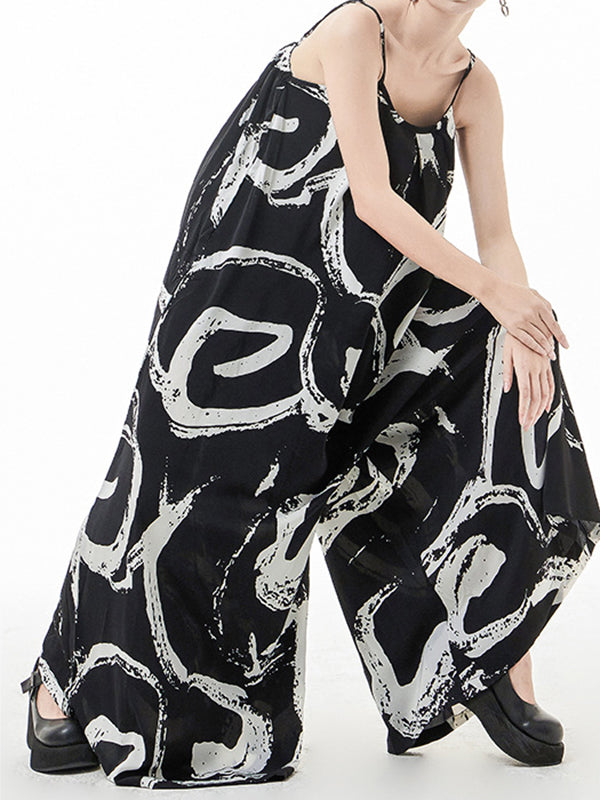 Stylish Loose Black Printed Spaghetti-Neck Wide Leg Jumpsuits