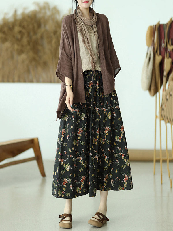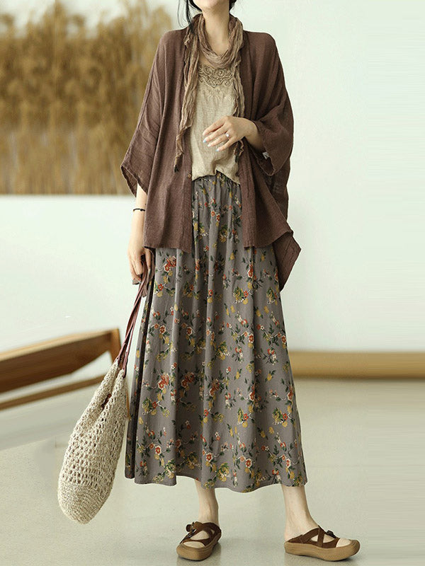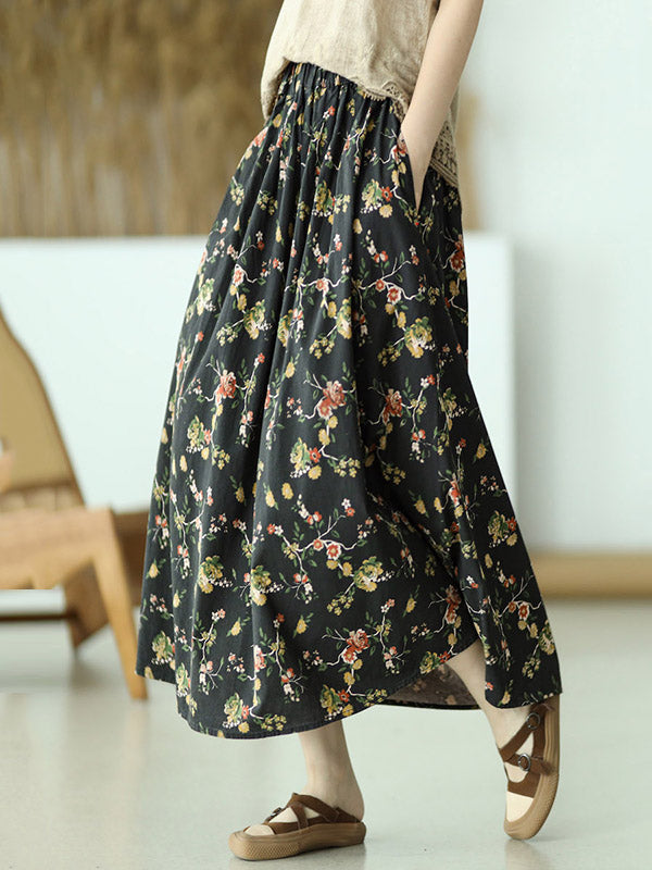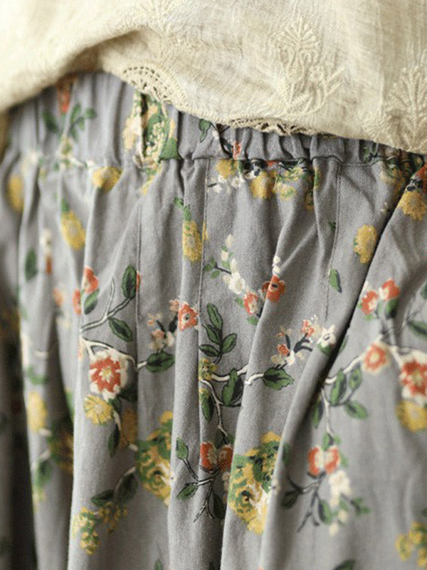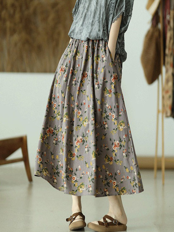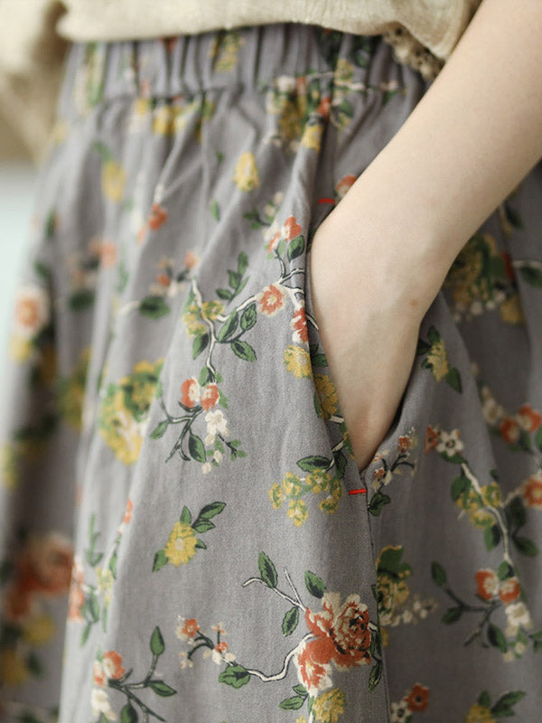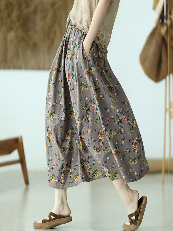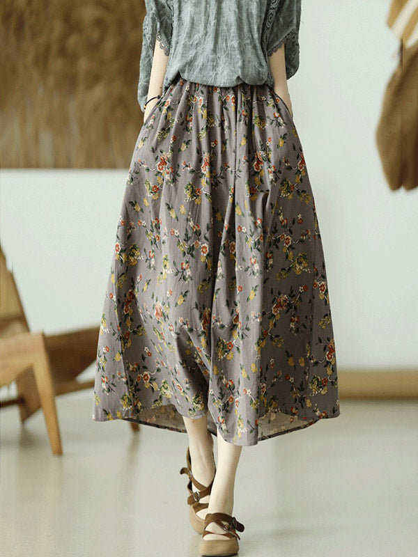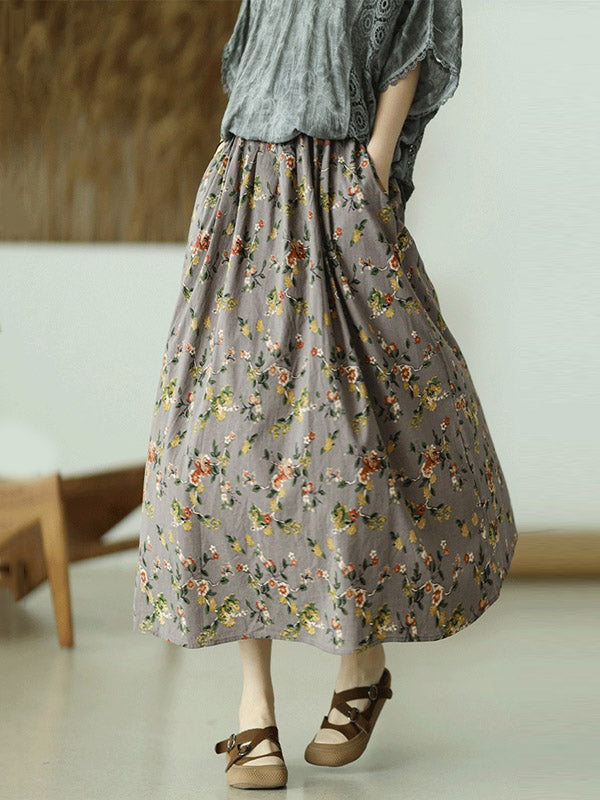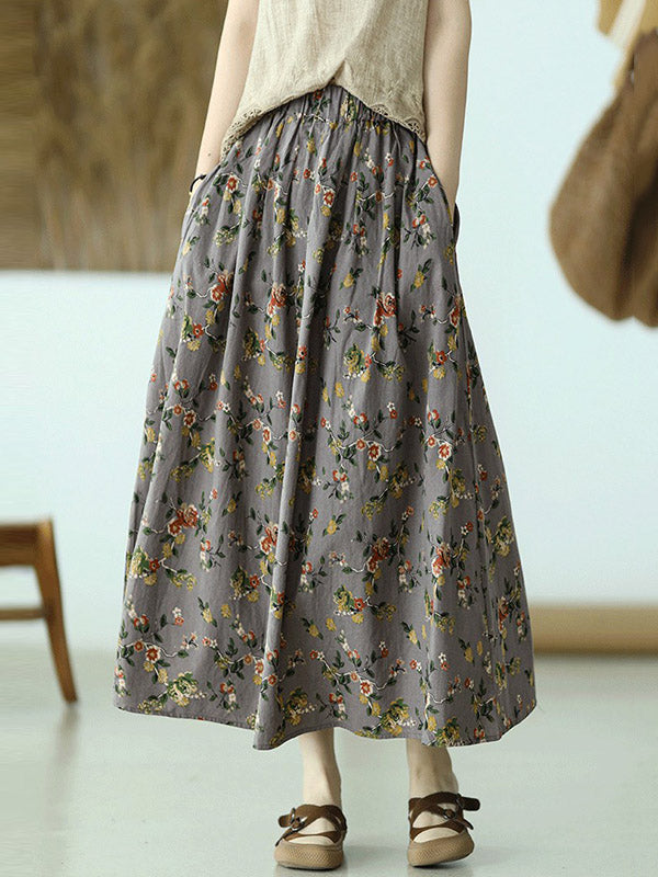 Stylish Ramie Cotton Floral Printed Loose A-Line Skirts