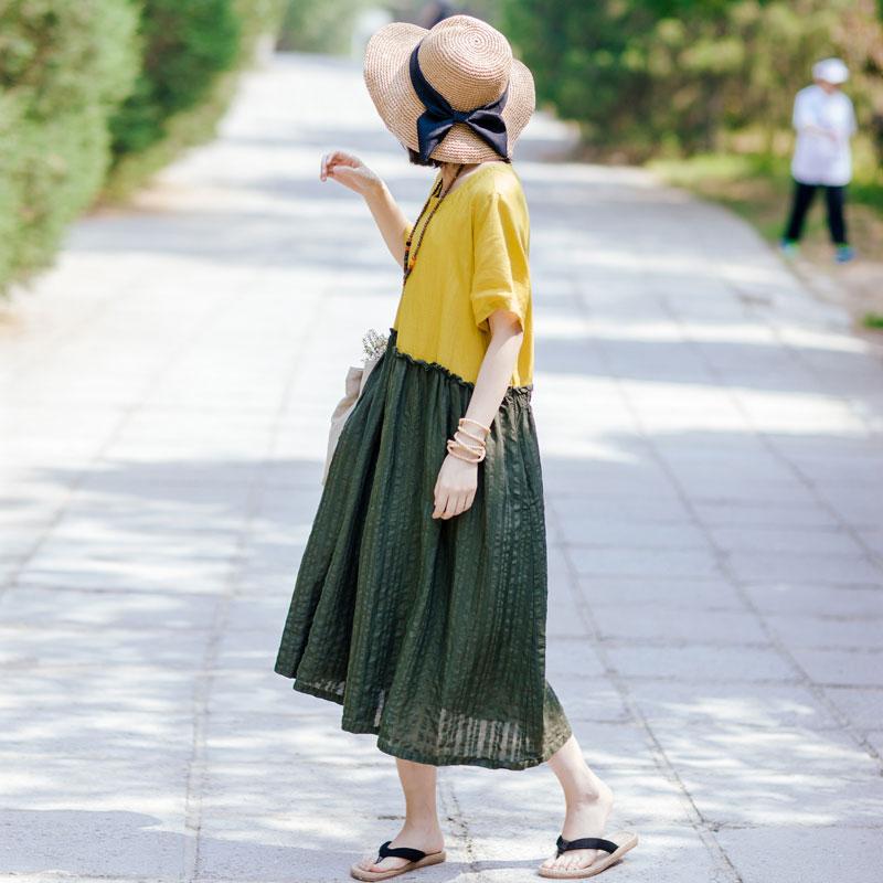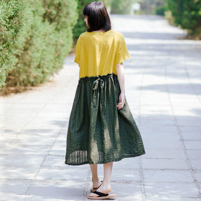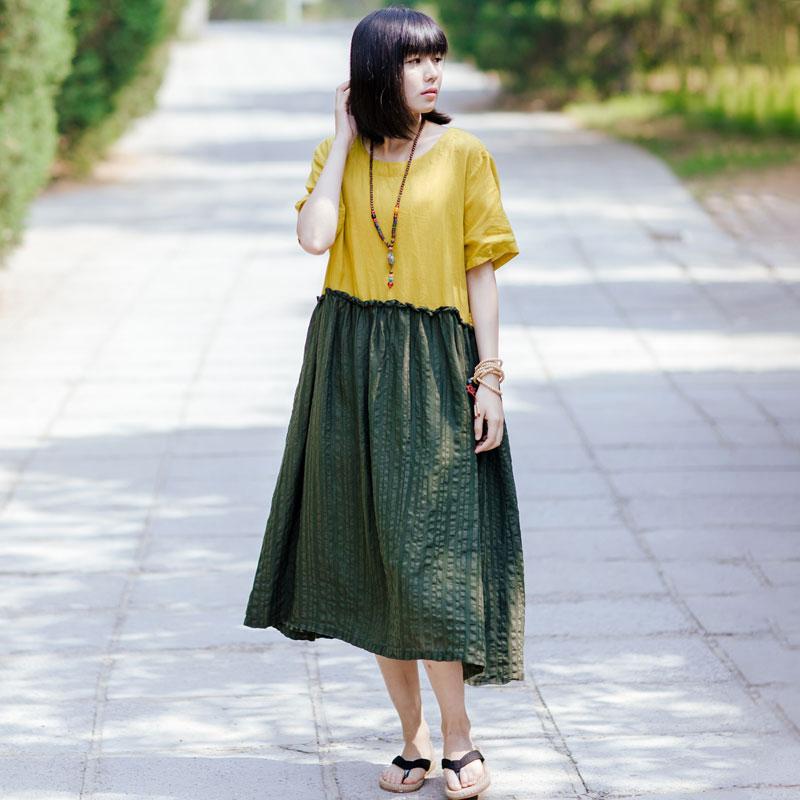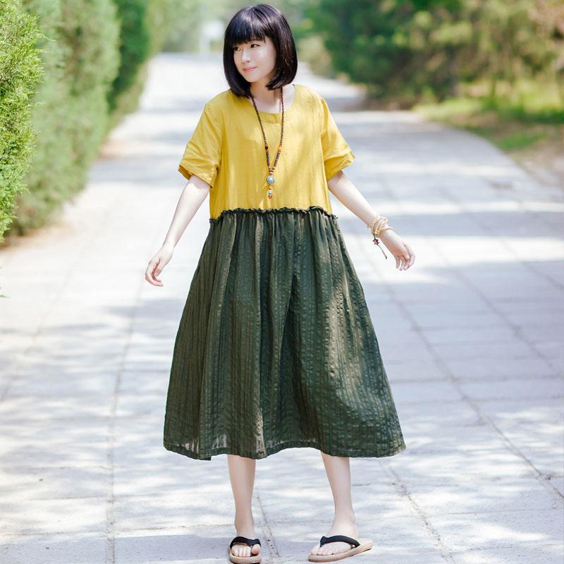 Summer Women Round Neck Short Sleeve Cotton Linen Pleated Dress