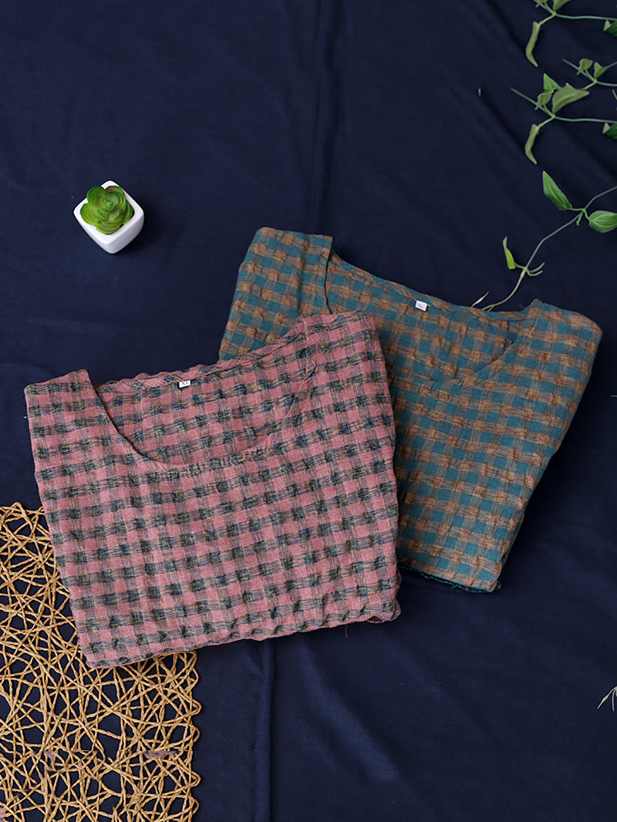 Plus Size Summer Plaid Round Neck Cotton Linen Midi Dress