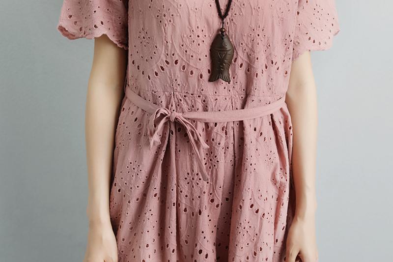 Summer Short Sleeve Lacing Pleated Pink Casual Dress